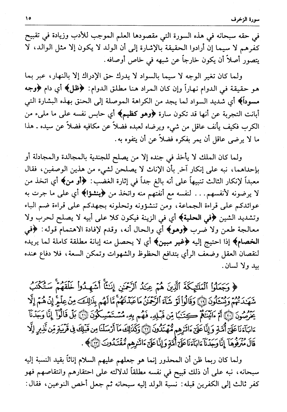 ) وَجَعَلُواْ الْمَلاَئِكَةَ الَّذِينَ هُمْ عِبَادُ الرَّحْمَنِ إِنَاثاً أَشَهِدُواْ خَلْقَهُمْ سَتُكْتَبُ شَهَادَتُهُمْ وَيُسْأَلُونَ وَقَالُواْ لَوْ شَآءَ الرَّحْمَنُ مَا عَبَدْنَاهُمْ مَّا لَهُم بِذَلِكَ مِنْ عِلْمٍ إِنْ هُمْ إِلاَّ يَخْرُصُونَ أَمْ آتَيْنَاهُمْ كِتَاباً مِّن قَبْلِهِ فَهُم بِهِ مُسْتَمْسِكُونَ بَلْ قَالُواْ إِنَّا وَجَدْنَآ آبَآءَنَا عَلَى أُمَّةٍ وَإِنَّا عَلَى آثَارِهِم مُّهْتَدُونَ وَكَذَلِكَ مَآ أَرْسَلْنَا مِن قَبْلِكَ فِي قَرْيَةٍ مِّن نَّذِيرٍ إِلاَّ قَالَ مُتْرَفُوهَآ إِنَّا وَجَدْنَآ آبَآءَنَا عَلَى أُمَّةٍ وَإِنَّا عَلَى آثَارِهِم مُّقْتَدُونَ ( ( )