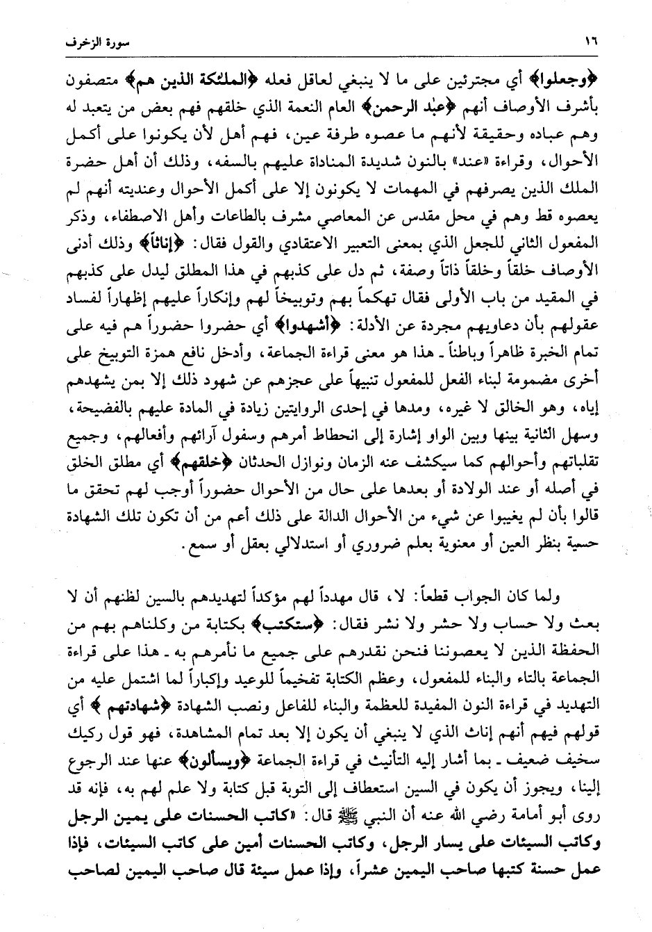 ولما كان الجواب قطعاًك لا ، قال مهدداً لهم مؤكداً لتهديدهم بالسين لظنهم أن لا بعث ولا حساب ولا حشر ولا نشر فقال : ( ستكتب ( بكتابة من وكلناهم بهم من الحفظة الذين لا يعصوننا فنحن نقدرهم على جميع ما نأمرهم به - هذا على قراءة التهديد في قراءة النون المفيدة للعظمة والبناء للفاعل ونصب الشهادة ) شهادتهم ) أي قولهم فيهم أنهم إناث الذي لا ينبغي أن يكون إلا بعد تمام المشاهدة ، فهو قول ركيك سخيف ضعيف - بما أشار إليه التأنيث في قراءة الجماعة ) ويسألون ( عنها عند الرجوع إلينا ، ويجوز أن يكون في السين استعطاف إلى التوبة قبل كتابة ولاعلم لهم به ، فإنه قد روى أبو أمامة رضي الله عنه أن النبي ( صلى الله عليه وسلم ) : ( كاتب الحسنات على يمين الرجل وكاتب السيئات على يسار الرجل ، وكاتب الحسنات أمين على كاتب السيئات ، فإذا عمل حسنة كتبها صاحب اليمين عشراً ، وإذا عمل سيئة قال صاحب اليمين لصاحب