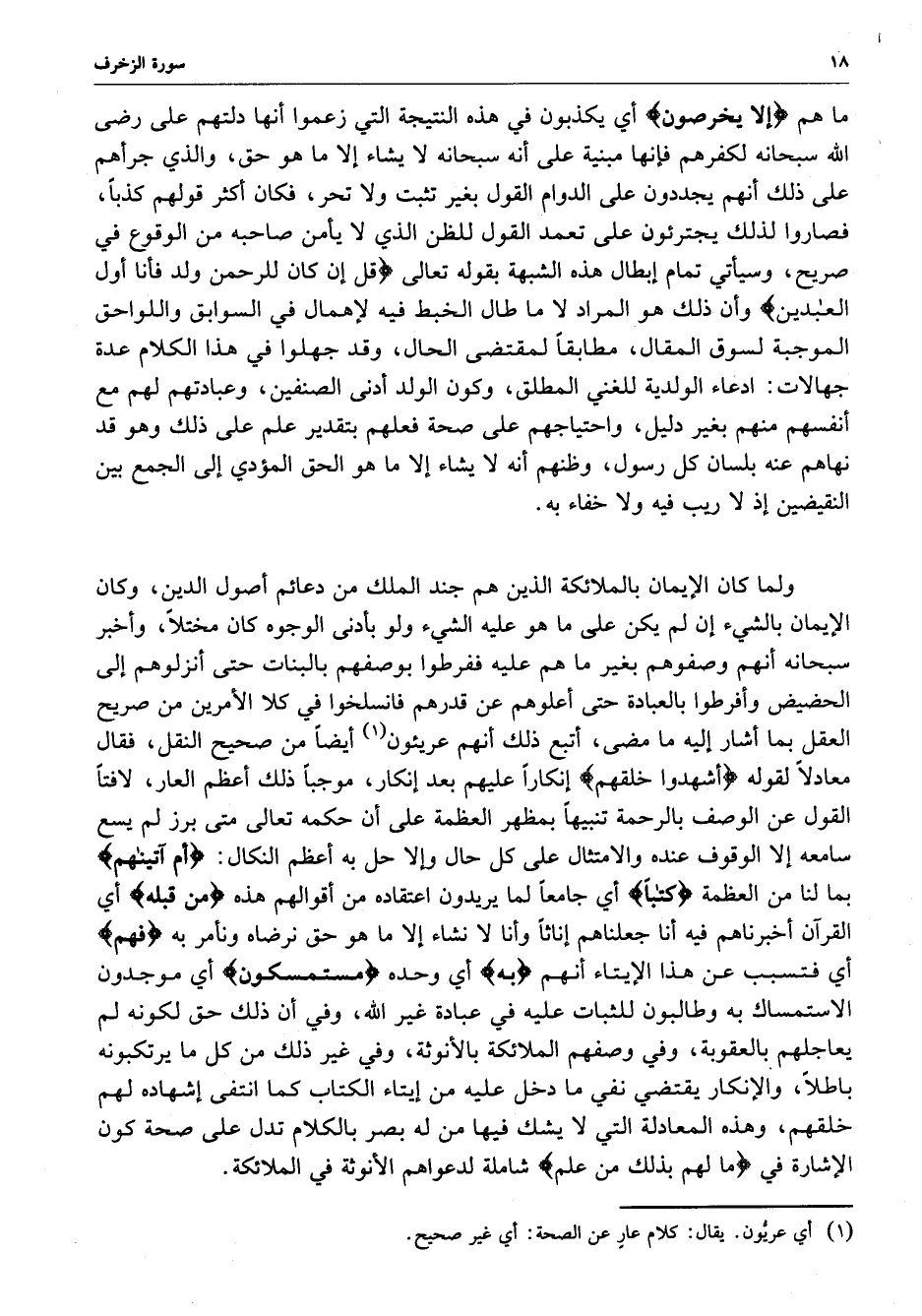 ما هم ) إلا يخرصون ) أي يكذبون في هذه النتيجة التي زعموا أنها دلتهم على رضى الله سبحانه لكفرهم فإنها مبنية على أنه سبحانه لا يشاء إلا ما هو حق ، والذين جرأهم على ذلك أنهم يجددون على الدوام القول بغير تثبت ولا تحر ، فكان أكثر قولهم كذباً ، فصاروا لذلك يجترئون على تعمد القول للظن الذي لا يأمن صاحبه من الوقوع في صريح ، وسيأتي تمام إبطال هذه الشبهة بقوله تعالى ) قل إن كان للرحمن ولد فأنا أول العابدين ( وأن ذلك هو المراد لا ما طال الخبط فيه لإهمال في السوابق واللواحق الموجبة لسوق المقال ، مطابقاً لمقتضى الحال ، وقد جهلوا في هذا الكلام عدة جهالات : ادعاء الولدية للغني المطلق ، وكون الولد أدنى الصنفين ، وعبادتهم لهم مع أنفسهم منهم بغير دليل ، واحتياجهم على صحة فعلهم بتقدير علم على ذلك وهو قد نهاهم عنه بلسان كل رسول ، وظنهم أنه لا يشاء إلا ما هو الحق المؤدي إلى الجميع بين النقيضين إذ لا ريب فيه ولا خفاء به .