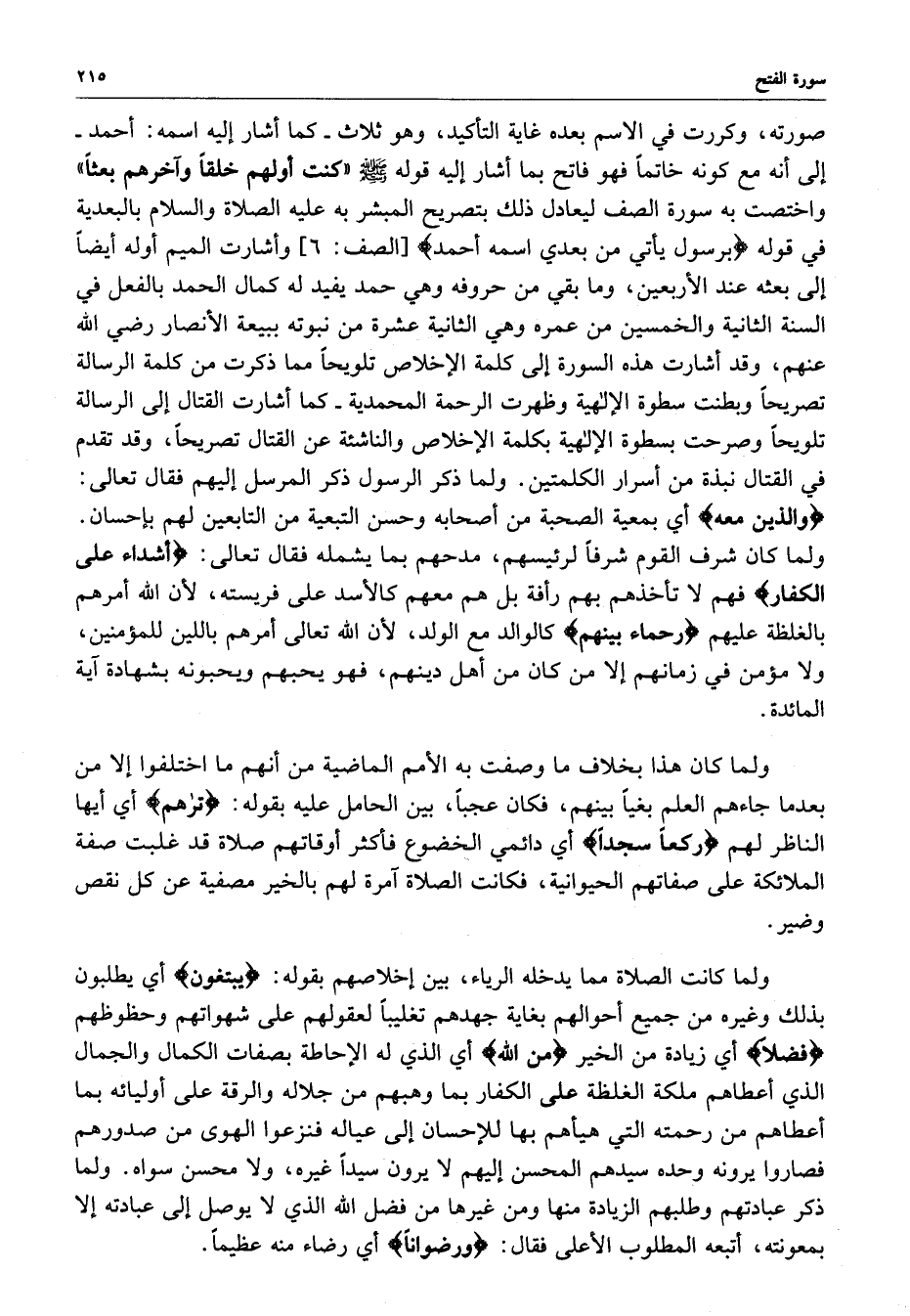 مقصودها مدلول اسمها الذي يعم فتح مكة وما تقدمه من صلح الحديبية وفتح خيبر ونحوهما ، وما وقع تصديق الخبر به من غلب الروم على أهل فارس وما تفرع من فتح مكة المشرفة من إسلام أهل جزيرة العرب وقتال أهل الردة وفتوح جميع البلاد الذي يجمعه كله إظهار الذين على الدين كله ، وهذا كله في غاية الظهور بما نطق ابتداؤها ) ليظهر على الدين كله ( ) محمد رسول الله ( إلى قوله ) ليغيظ بهم الكفار ) أي بالفتح الأعظم وما دونه من الفتوحات ) وعد الله الذين آمنوا وعملوةا الصالحات منهم مغفرة ( كما كان في أولهاع للرسول ( صلى الله عليه وسلم ) ) وأجرا عظيما ( كذلك بسائر الفتوحات وما حوت من اللغنائم للثواب الجزيل على ذلك في دار الجزاء ) بسم الله ( الملك الأعظم المحيط بكل شيء قدرة وعلما ) الرحمن ( الذي عم المكلفين بنعمة الوعد والوعيد ) الرحيم ( الذي اختص أهل حزبه لأقامة دينه الحق فأظهرهم على سائر العبيد