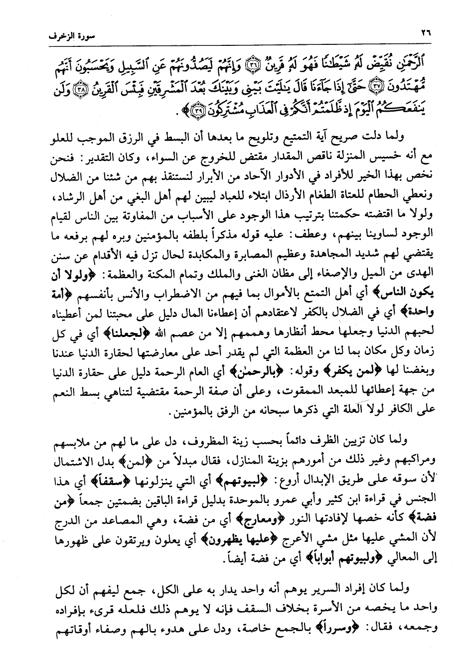 ولما كان تزيين الظرف دائماً بحسب زينة المظروف ، دل على ما لهم من ملابسهم ومراكبهم وغير ذلك من أمورهم بزينة المنازل ، فقال مبدلاً من ) لمن ( بدل الاشتمال لأن سوقه على طريق الإبدال أروع : ( لبيوتهم ) أي التي ينزلونها ) سقفاً ) أي هذا الجنس في قراءة ابن كثير وأبي عمرو بالموحدة بدليل قراءة الباقين بضمتين جمعاً ) من فضة ( كأنه خصها لإفادتها النور ) ومعارج ) أي من فضة ، وهي المصاعد من الدرج لأن المشي عليها مثل مشي الأعرج ) عليها يظهرون ) أي يعلون ويرتقون على ظهورها إلى المعالي ) ولبيوتهم أبواباً ) أي من فضة أيضاً .