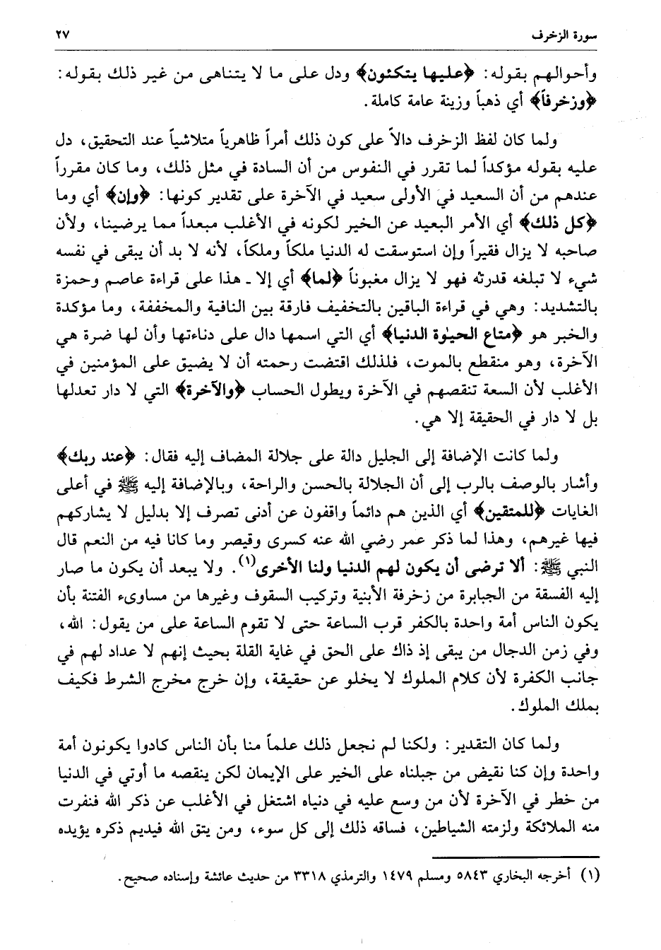 ولما كانت الإضافة إلى الجليل دالة على جلالة إليه فقال : ( عند ربك ( وأشار بالوصف بالرب إلى أن الجلالة بالحسن والراحة ، وبالإضافة إليه ( صلى الله عليه وسلم ) في أعلى الغايات ) للمتقين ) أي الذين هم دائماً واقفون عن أدنى تصرف إلا بدليل لا يشاركهم فيها غيرهم ، وهذا ملا ذكر عمر رضي الله عنه كسرى وقيصر وما كانا فيه من النعم قال النبي ( صلى الله عليه وسلم ) : ( لا ترضى أن يكون لهم الدنيا ولنا الأخرى ) ولا يبعد أن يكون ما صار إليه الفسقة من الجبابرة من زخرفة الأبنية وتركيب السقوف وغيرها من مساوئ الفتنة بأن يكون الناس أمة واحدة بالكفر قرب الساعة حتى لا تقوم الساعة على من يقول : الله ، وفي الزمن الدجال من يبقى إذ ذاك على الحق في غاية القلة بحيث إنهم لا عداد لهم في جانب الكفرة لأن كلام الملوك لا يخلو عن حقيقة ، وإن خرج مخرج الشرط فكيف بملك الملوك .