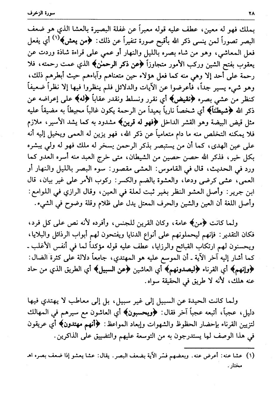 بملك فهو له معين ، عطف عليه قوله معبراً عن غفلة البصيرة بالعشا الذي هو ضعف البصر تصوراً لم نينسى ذكر الله بأقبح صورة تنفيراً عن ذلك ) من يعش ) أي يفعل فعل المعاشي ، وهو من شاء بصره بالليل والنهار أو عمي على قراءة شاذه وردت عن يعقوب بفتح الشين وركب الأمور متجاوزاً ) عن ذكر الرحمن ( الذي عمت رحمته ، فلا رحمة على أحد إلا وهي منه كما فعل هؤلاء حين متعناهم وآباءهم حيث أبطرهم ذلك ، وهو شيء يسير جداً ، فأعرضوا عن الآية والدلائل فلم ينظروا فيها إلا نظراً ضعيفاً كنظر من عشي بصره ) نقيض ) أي نقرر ونسلط ونقدر عقاباً ) له ( على إعراضه عن ذكر الله ) شيطاناً ) أي شخصاً نارياً بعيداً من الرحمة يكون غالباً محيطاً به مضيقاً عليه مثل قيض البيضة وهو القشر الداخل ) فهو له قرين ( مشدود به كما يشد الأسير ، ملازم فلا يمكنه التخلص منه ما دام متعامياً عن ذكر الله ، فهو يزين له العمى ويخيل إليه أنه على عين الهدى ، كما أن من يستبصر بذكر الرحمن يسخر له ملك فهو له ولي يبشره بكل خير ، فذكر الله حصن حصين من الشطيان ، متى خرج العبد منه أسره العدو كما ورد في الحديث ، قال في القاموس : العشى مقصور : سوء البصر بالليل والنهار أو العمى ، عشى كرضى ودعا ، والعشوة بالضم والكسر : ركوب الأمر على غير بيان ، قال ابن جرير : وأصل العشو النظر بغير ثبت لعلة في العين ، وقال الرازي في اللوامع : وأصل اللغة أن العين والشين والحرف المعتل يدل على ظلام وقلة وضوح في الشيء .