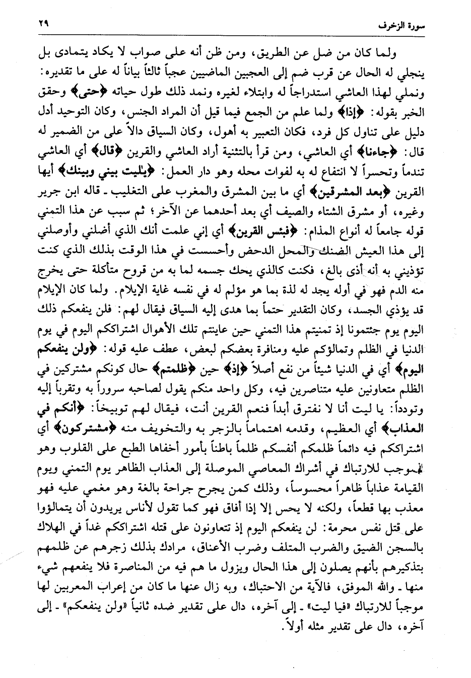 ولما كان الإيلام قد يؤذي الجسد ، وكان التقدير حتماً بما هدى إليه السياق فيقال لهم : فلن ينفعكم ذلك اليوم يوم جئتمونا إذ تمنيتهم هذا التمني حين عاينتم تلك الأهوال اشتراككم اليوم في يوم الدنيا في الظلم وتمالؤكم عليه منافرة بعضكم لبعض ، عطف عليه قوله : ( ولن ينفعكم اليوم ) أي في الدنيا شيئاً من نفع أصلاً ) إذ ( حين ) ظلمتم ( حال كونكم مشتركين في الظلم متعاونين عليه متناصرين فيه ، واحد منكم يقول لصاحبه سروراً به وتقرباً إليه وتودداً : يا ليت أنا لا نفترق أبدالً فنعم القرين أنت ، فيقال لهم توبيخاً : ( أنكم في العذاب ) أي العظيم ، وقدمه اهتماماً بالزجر به والتخويف منه ) مشتركون ) أي اشتراككم فيه دائماً ظلمكم أنفسكم ظلماً باطناً بأمور أخفاها الطبع على القلوب وهو موجب للارتباك في أشراك المعاصي الموصلة إلى العذاب الظاهر يوم التمني ويوم القيامة عذاباً ظاهراً محسوساً ، وذلك كمن يجرح جراحة بالغة وهو مغمي عليه فهو معذب بها قطعاً ، ولكنه لا يحس إلا إذا أفاق فهو كما تقول أناس يريدون أن يتمالؤوا على قتل نفس محرمة : لن ينفعكم اليوم إذا تتعاونون على قتله اشتراككم غداً في الهلاك بالسجن الضيق والضرب المتلف وضرب الأعناق ، مرادك بذلك زجرهم عن ظلمهم بتذكيرهم بأنهم يصلون إلى هذا الحال ويزول ما هم فيه من المناصرة فلا ينفعهم شيء منها - والله الموفق ، فالآية من الحتباك ، وبه زال عنها ما كان من إعراب المعربين لها موجباً للرتباك ( فيا ليت ) - إلى آخره ، دال على تقدير ضده ثانياً ( ولن ينفعكم ) - إلى آخره ، دال على تقدير مثله أولاً .