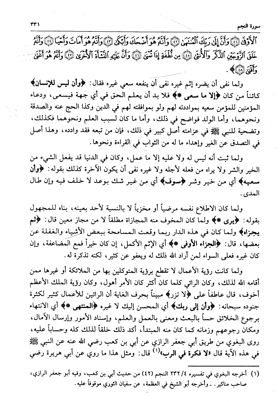 حقيقة أو حكماً وكل حسن مرتفع ، فلذلك يلتحق بأبيه ، وأما الإساءة فقاصرة على صاحبها يؤخذ بها ويرهن بذنبه ولا يؤخذ بذنب غيره ، والحاصل أن المعالي التي هي كالحياة تفيض من صاحبها على غيره فتحييه ، والمساوئ التي هي كالموت لا يتعدى صاحبها ، قال الرازي في اللوامع : اعلم أن الذوات بقاؤها ودوامها ببقاء صورها ، فحيث ما كانت الصورة المقومة لها أدوم كانت الذوات بها أقوم ، وأن النفوس الإنسانية ذوات وصورها علومها وأخلاقها ، فحيث ما كانت العلوم حق اليقين ثم عين اليقين ، والأخلاق مقومة على نهج الشرع المبين ، كانت النفوس دائمة بدوامها غير مستحيلة ، إذ لا تتطرق الاستحالة إلى اليقين والعمل الحق ، وغير كائنة ولا فاسدة إذ ليس عن اليقين ولا العلوم الحقيقية من عالم الكون والفساد ، وإن لم تبلغ النفس إلى كمال اليقين فتعلقت بدليل صاحبه كما انخرطت في سلكها حتى يخرط الإنسان في سلك محبته ، لو أحب أحدكم حجراً لحشر معه ، فإن الدين هو الحب في الله والبغض في الله ، ولهذا اكتفى الشرع من المكلفين بالإسلام وتسليم وتفويض وتحكيم دون الوقوف على المسائل العويصة بالبراهين الواضحة الصحيحة ، وما لم يبلغ الولد حد التكليف واخترم ألحقوا بآبائهم وحكم عليهم بحكم عقائدهم وآرائهم حتى يكون حكم آبائهم جارياً عليهم وحكم القيامة نافذاً فيهم ، وأما إذا كانت الصورة القائمة بالذوات مستحيلة بأن كانت جهلاً وباطلاً ينقص أوله آخره وآخره أوله ، كانت ذات النفس لا تنعدم ولا تفنى بل تبقى على حال لا يموت فيها ولا يحي ، فإنها لو فنيت لاستراحت ولو بقيت لاستطابت ، فهي على استحالة بين الموت والحياة ، وهذه الاستحالة لا تكون إلا في أجساد وأبدان ) ) كلما نضجت جلودهم بدلناهم جلوداً غيرها ( ) [ النساء : 56 ] انتهى .