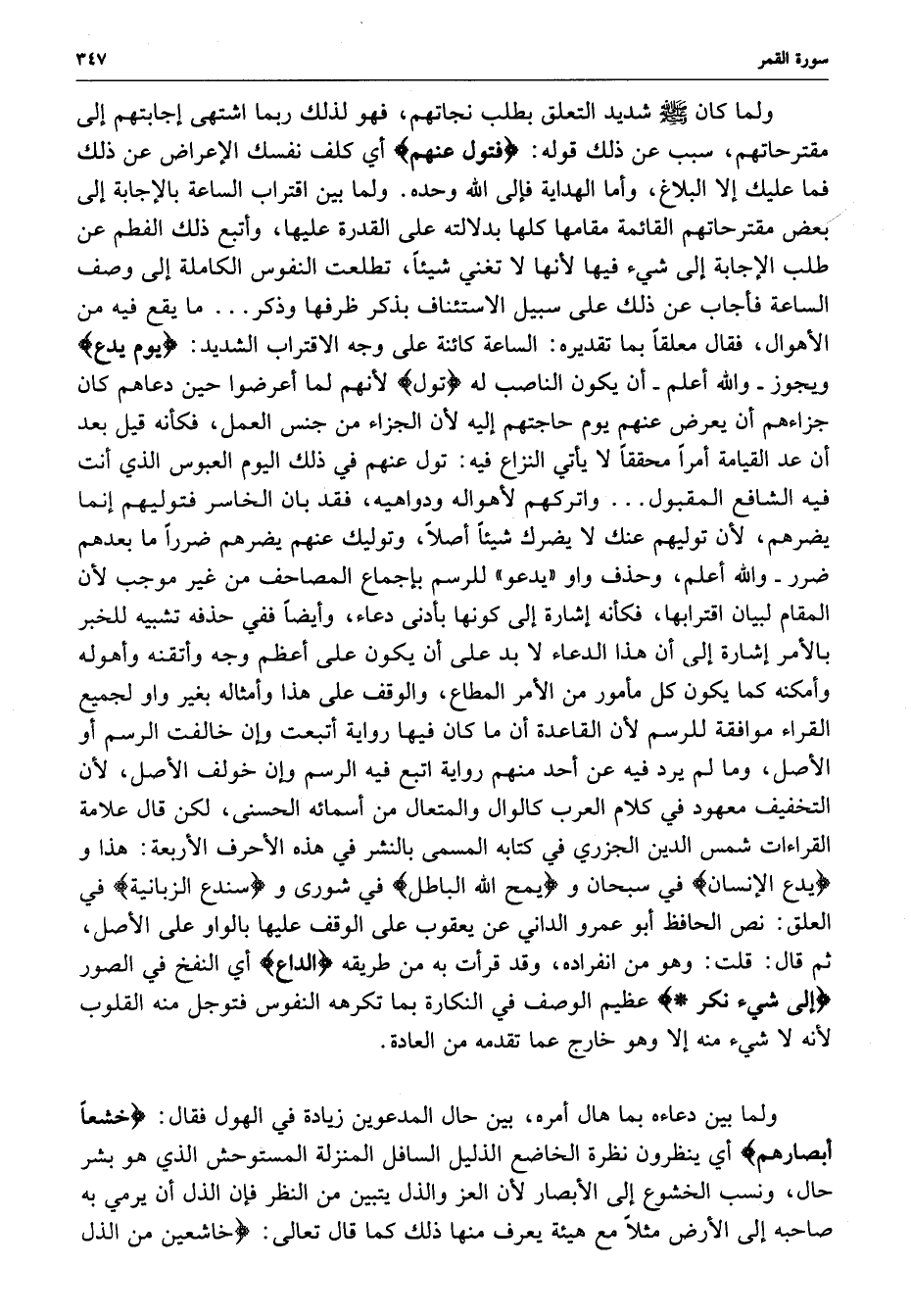 ولما كان الدنو من الحضرة الإليهة - التي هي مهيئة لتلقي الوحي - من العلو والعظمة بحيث لا يوصف ، أشار إلى ذلك بأداة التراخي فقال : ( ثم ) أي بعد ذلك الاستواء العظيم ) دنا ) أي جبرائيل عليه السلام من الجناب الأقدس دنو زيادة في كرامة لا دنو مسافة ، وكل قرب يكون منه سحبانه فهو مع أنه منزه عن المسافة الموجود وبصره وجهين : قرب إلى كل موجود من نفسه ، وقرب لاية حتى يكون سمع الموجود وبصره بمعنى أنه لا يسمع ولا يبصر إلا ما يرضاه - اشار إليه ابن برجان ، فأخذ الوحي الذي أذن له في أخذه في ذلك الوقت ) فتدلّى ( عقب ذلك من الله رسولاً إلى صاحبكم أي أنزل إليه نزولاً هو فيه كالمتدلي إليه بحبل فوصل إليه ولم ينفصل عن محله من الأفق الأعلى لما له من القوة والاستحكام ، قال البيضاوي : فإن التدلي هو استرتسال متعلق كتدلي الثمرة ) فكان ( في القرب من صاحبكم في رأي من يراه منكم ) قاب ) أي على مسافة قدر ) قوسين ( من قسيكم ، قال الرازي في اللوامع : أي بحيث الوتر في القوس مرتين ، وعن ابن عباس رضي الله عنهما : القوس الذراع بلغة أزدشنوءة ، وقال ابن برجان : قاب القوسين : ما بين السيين ، وقيل : ما بين القبضة والوتر ) أو أدنى ( بمعنى أن الناظر منكم لو رآه لتردد وقال ذلك لشدة مايرى له من القرب منه ( صلى الله عليه وسلم ) ، روى مسلم في الإيمان من صحيحه عن الشيباني قال : ( سألت زر بن حبيش عن قوله تعالى ) فكان قاب قوسين ( فقال : أخبرني أبن مسعود رضي الله عنه أن النبي ( صلى الله عليه وسلم ) رأى جبرائيل عليه السلام له ستمائة جناح ) ) فأوحى ) أي ألقى سراً من كلام الله بسبب هذا القرب ، وعقبه بقوله : ( إلى عبده ) أي عبد الله ، وإضماره من غير تقدم ذكره صريحاً لما هو معلوم مما تقدم في آخر الشورى أن كلام الله يكون وحياً بواسطة رسول يوحي