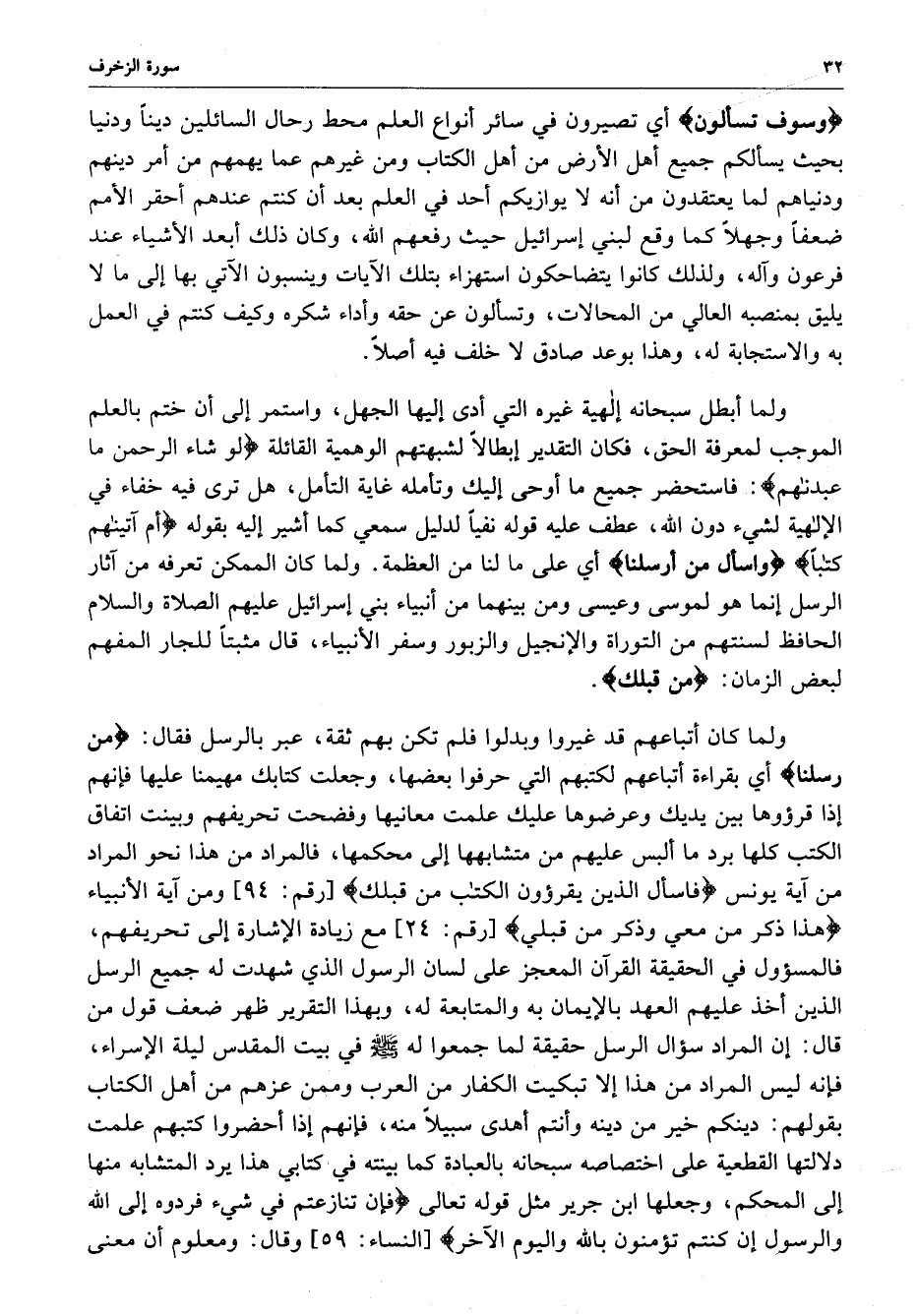 [ رقم : 24 ] مع زيادة الإشارة إلى تحريفهم ، فالمسؤول في الحقيقة القرآن المعجز على لسان الرسول الذي شهدت له جميع الرسل الذين أخذ عليهم العهد بالإيمان به والمتابعة له ، وبهذا التقرير ظهر ضعف قول من قال : إن المراد سؤال الرسل حقيقة لما جمعوا له ( صلى الله عليه وسلم ) في بيت المقدس ليلة الإسراء ، فإنه ليس المراد من هذا إلا تبكيت الكفار من العرب وممن عزهم من أهل الكتاب بقولهم : دينكم خير من دينه وأنتم أهدى سبيلاً منه ، فإنهم إذا أحضروا كتبهم علمت دلالتها القطعية على اختصاصه سبحانه بالعبادة كما بينته في كتابي هذا يرد المتشابه منها إلى المحكم ، وجعلها ابن جرير مثل قوله تعالى