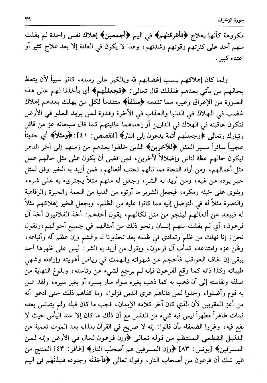 [ القصص : 41 ] : ( ومثلاً ) أي حديثاً عجيباً سائراً مسير المثل ) للآخرين ( الذين خلفوا بعدهم من زمنهم إلى آخر الدهر فيكون حالهم عظة لناس وإضلالاً لآخرين ، فمن قضى أن يكون على مثل حالهم عمل مثل أعمالهم ، ومن أراد النجاة مما نالهم تجنب أفعالهم ، فمن أريد به الخير وفق لمثل خير يرده عن غيه ، ومن أريد به الشر ، وجعل له منهم مثلاً يجترئ به على شره ، ويقوى على خبثه ومكره ، فيجعل الشرير ما أوتوه من الدنيا من النعمة والحبرة الرفاهية والنصرة مثلاً له في التوصل إليه مما كانوا عليه من الظلم ، ويجعل الخير إهلاكهم مثلاً له فيبعد عن أفعالهم لينجو من مثل نكالهم ، يقول أحدهم : أخذ الفلانيون أخذ آل فرعون ، أي لم يفلت منهم إنسان ونحو ذلك من أمثالهم في جميع أحوالهم ، ونقول نحن : إنا نهلك من ظلم وتمادى في ظلمه بعد تحذيرنا له وغشم وإن عظم آله وأتباعه ، وظن عزه وامتناعه ، كدأب آل فرعون ، ويقول من أريد به الشر : ليس على ظهرها أحد يبقى إن خاف العواقب فأحجم عن شهواته وانهمك في رياض أهويته وإرادته وشهي طيباته وكذا ذاته كما وقع لفرعون فإنه لم يرجع لشيء عن رئاسته ، وبلوغ النهاية منه صلفه ونفاسته إلى أن ذهب به كما ذهب بغيره سواء سار بسيره أو بغير سيره ، ولقد ضل به قوم وأضلوا ، وحلوا لمن داناهم عرى الدين فزلوا ، وما كفاهم ذلك حتى ادعوا أنه من أعز المقربين لأن الذي كان آخر كلامه الإيمان ، فجب ما كانا قبله ولم يتدنس بعده فمات طاهراً مطرهاً ليس فيه شيء من الدنس مع أن ذلك ما كان إلا عند اليأس حيث لا نفع فيه ، وغروا الضعفاء بأن قالوا : إنه لا صريح في القرآن بعذابه بعد الموت تعمية عن الدليل القطعي المنتظم من قوله تعالى