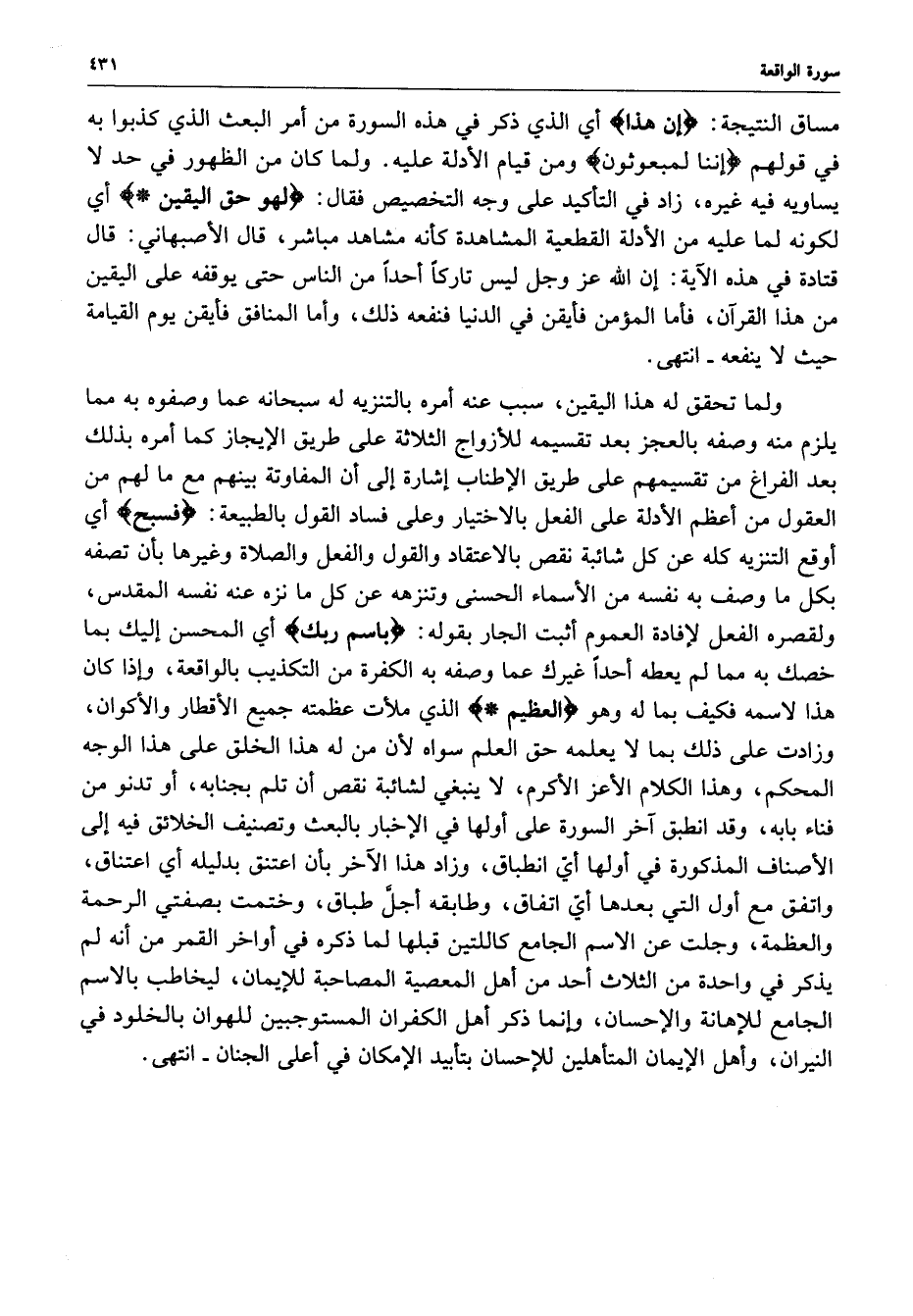 [ القمر : 18 ] ستاً إلى الجهات الست من جهة الوراء والخلف ، أوترها بنعمة أخرى واحدة إشارة إلى أن السبب في هذا اعتقاد وحدانية الواحد تعالى اعتقاداً أدى الخضوع لأمر مرسل كلما جاء من عنده تعالى فلذلك كانت نعمة لا تنقطع أصلاً ، بل كلما تم دور منها ابتدأ دور آخر جديد ، وهكذا على وجه لا انقطاع له أبداً كما أن الواحد الذي هو أصل العدد لا انتهاء له أصلاً ، وهذه النعمة الدالة على الراحة الدائمة التي هي المقصودة بالذات على وجه لا يرى أغرب منه ولا أشرف ، فقال تعالى مبيناً حال المحسنين ومن دونهم مشركاً لهم في الراحة على ما لا عين رأت ولا أذن