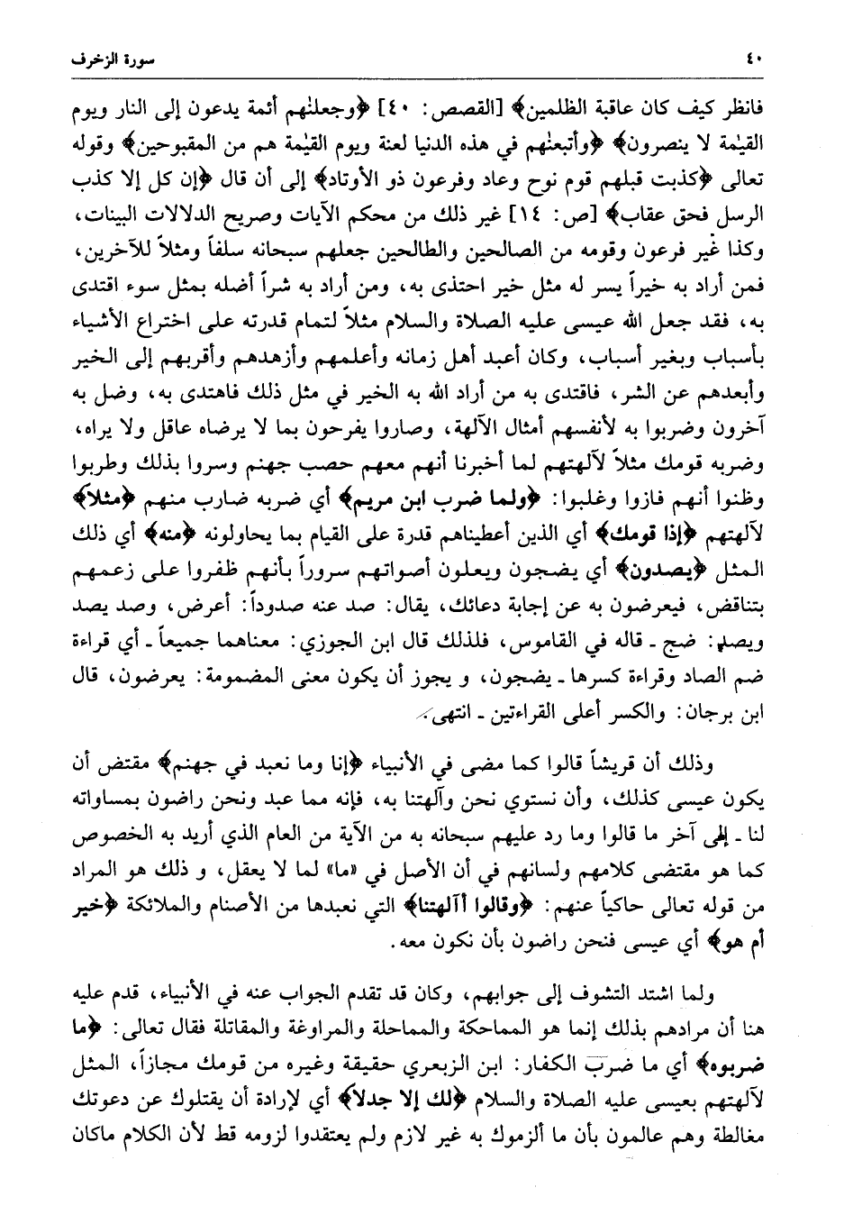 وذلك أن قريشاً قالوا كما مضى في الأنبياء ) إنا وما نعبد في جهنم ( مقتض أن يكون عيسى كذلك ، وأن نستوي نحند وآلهتنا به ، فإنه مما عبد ونحن راضون بمساواته لنا - إلى آخر ما قالوا وما رد عليهم سبحانه به من الآية من العام الذي أريد به الخصوص كما هو مقتضى كلامهم ولسانهم في أن الأصل في ( ما ) لما لا يعقل ، وذلك هو المراد من قوله تعالى حاكياً عنهم : ( وقالوا آلهتنا ( التي نعبدها من الأصنام والملائكة ) خير أم هو ) أي عيسى فنحن راضون بأن نكون معه .