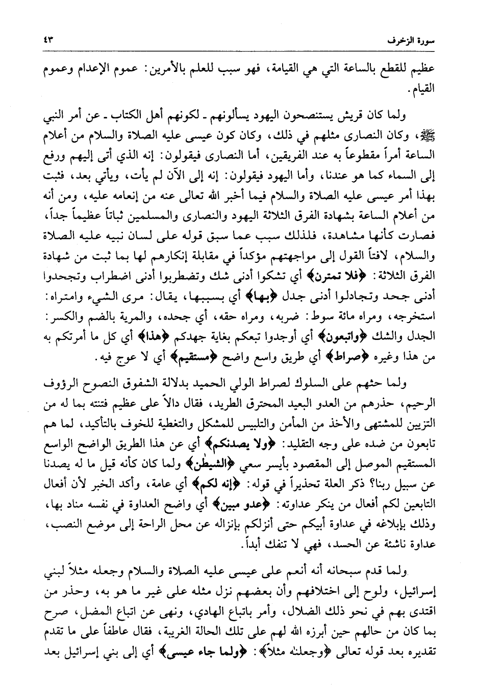 ولما كان قريش يستنصحون اليهود يسألونهم - لكونهم أهل الكتاب - عن أمر النبي ( صلى الله عليه وسلم ) ، وكان النصارى مثلهم في ذلك ، وكان كون عيسى عليه الصلاة والسلام من أعلام الساعة أمراً مقطوعاً به عند الفريقين ، أما النصارى فيقولون : إنه الذي أتى إليهم ورفع إلى السماء كما هو عندنا ، وأما اليهود فيقولون : إنه إلى الآن لم يأت ، ويأتي بعد ، فثبت بهذا أمر عيسى عليه الصلاة والسلام فيما أخبر الله تعالى عنه من إنعامه عليه ، ومن أنه من أعلام الساعة بشهادة الفرق الثلاثة اليهود والنصارى والمسلمين ثباتاً عظيماً جداً ، فصارت كأنها مشاهدة ، فلذلك سبب عما سبق قوله على لسان نبيه عليه الصلاة والسلام ، لافتاً القول إلى مواجهتهم مؤكداً في مقابلة إنكارهم لها بما ثبت من شهادة الفرق الثلاثة : ( فلا تمترن ) أي تشكوا أدنى شك وتضطربوا أدنى اضطراب وتجحدوا أدنى جحد وتجادلوا أدنى جدل ) بها ) أي بسببها ، يقال : مرى الشيء وامتراه : استخرجه ، ومراه مائة سوط : ضربه ، ومراه حقه ، أي جحده ، والمرية بالضم والكسر : الجدل والشك ) واتبعون ) أي أوجدوا تبعكم بغاية جهدكم ) هذا ) أي كل ما أمرتكم به من هذا وغيره ) صراط ) أي طريق واسع واضح ) مستقيم ) أي لا عوج فيه .