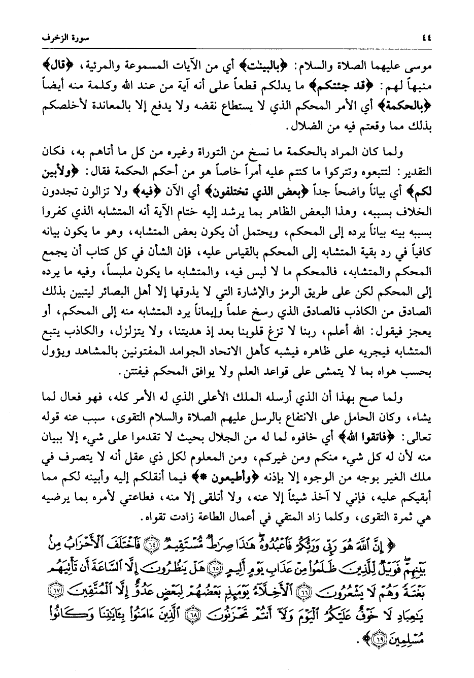 ) إِنَّ اللَّهَ هُوَ رَبِّي وَرَبُّكُمْ فَاعْبُدُوهُ هَذَا صِرَاطٌ مُّسْتَقِيمٌ فَاخْتَلَفَ الأَحْزَابُ مِن بَيْنِهِمْ فَوَيْلٌ لِّلَّذِينَ ظَلَمُواْ مِنْ عَذَابِ يَوْمٍ أَلِيمٍ هَلْ يَنظُرُونَ إِلاَّ السَّاعَةَ أَن تَأْتِيَهُمْ بَغْتَةً وَهُمْ لاَ يَشْعُرُونَ الأَخِلاَّءُ يَوْمَئِذٍ بَعْضُهُمْ لِبَعْضٍ عَدُوٌّ إِلاَّ الْمُتَّقِينَ يعِبَادِ لاَ خَوْفٌ عَلَيْكُمُ الْيَوْمَ وَلاَ أَنتُمْ تَحْزَنُونَ الَّذِينَ آمَنُواْ بِآيَاتِنَا وَكَانُواْ مُسْلِمِينَ ( ( )