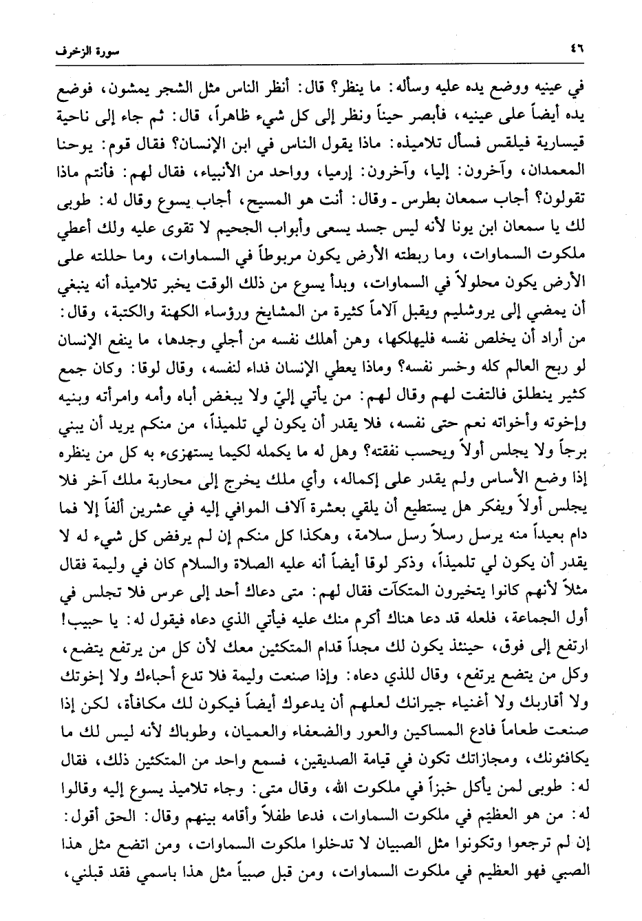 في عينيه ووضع يده عليه وسأله : ما ينظر ؟ قال : أنظر الناس مثل الشجر يمشون ، فوضع يده أيضاً على عينيه ، فأبصر حيناً ونظر إلى كل شيء ظاهراً ، قال : ثم جاء إلى ناحية قيسارية فيلقس فسأل تلاميذه : ماذا يقول الناس في ابن الإنسان ؟ فقال قوم : يوحنا المعمدان ، وآخرون : إليا ، وآخرون : إرميا ، وواحد من الأنبياء ، فقال لهم : فأنتم ماذا تقولون ؟ أجاب سمعان بطرس - وقال : أنت هو المسيح ، أجاب يسوع وقال له : طوبى لك يا سمعان ابن يونان لأنه ليس جسد يعسى وأبواب الجحيم لا تقوى عليه ولك أعطي ملكوت السماوات ، وما ربطته الأرض يكون مربوطاً في السموات ، وما حللته على الأرض يكون محلولاً في السموات ، وبدأ يسوع من ذلك الوقت يخبر تلاميذه أنه ينبغي أن يمضي إلى يروشلين ويقبل الآماً كثيرة من المشايخ ورؤساء الكهنة والكتبة ، وقال : من أراد أن يخلص نفسه فليهلكها ، وهن أهلك نفسه من أجلي وجدها ، وما ينع الإنسان لو ربح العالم كله وخسر نفسه ؟ وماذا يعطي الإنسان فداء لنفسه ، وقال لوقا : وكان جمع كثير ينطلق فالتفت لهم وقال لهم : من يأتي إليّ ولا يبغض أباه وأمه وامرأته وبينه وإخوته وأخواته نعم حتى نفسه ، فلا يقدر أن يكون لي تلميذاً ، من منكم يريد أن يبني برجاً ولا يجلس أولاً ويحسب نفقته ؟ وهل له ما يكمله لكيما يستهزىء به كل من ينظره إذا وضع الأساس ولم يقدر على إكماله ، وأي ملك يخرج إلى محاربة ملك آخر فلا يجلس أولاً ويفكر هل يستطيع أن يلقي بعشرة آلاف الموافي إيه في عشرين ألفاً إلا فما دام بعيداً منه يرسل رسلاً رسل سلامة ، وهكذا كل منكم إن لم يرفض كل شيء له لا يقدر أن يكون لي تلميذاً ، وذكر لوقا أيضاً أنه عليه الصلاة والسلام كان في وليمة فقال مثلاً لأنهم كانوا يتخيرون المتكآت فقال لهم : متى دعاك أحد إلى عرس فلا تجلس في أول الجماعة ، فلعله قد دعا هناك أكرم منك عليه فيأتي الذي دعاه فيقول له : يا حبيب ارتفع إلى فوق ، حينئذ يكون لك مجداً قدام المتكئين معك لأن كل من يرتفع يتضع ، وكل من يتضع يرتفع ، وقال للذي دعاه : وإذا صنعت وليمة فلا تدع أحباءك ولا إخوتك ولا أقاربك ولا إغنياء جيرانك لعلهم أن يدعوك أيضاً فيكون لك مكافأة ، لكن إذا صنعت طعاماً فادع المساطكين والعور والضعفاء والعميان ، وطوباك لأنه ليس لك ما يكافئونك ، ومجازاتك تكون في قيامة الصديقين ، فسمع واحد من المتكئين ذلك ، فقال له : طوبى لمن يأكل خبزاً في ملكوت الله ، وقال متى : وجاء تلاميذ يسوع إليه وقالوا له : من هو العظيم في ملكوت السماوات ، فدعا طفلاً وأقامه بينهم وقال : الحق أقول : إن لم ترجعوا وتكونوا مثل الصبيان لا تدخلوا ملكوت السماوات ، ومن اتضع مثل هذا الصبي فهو العظيم في ملكوت السماوات ، ومن قبل صبياً مثل هذا باسمي فقد قبلني ،