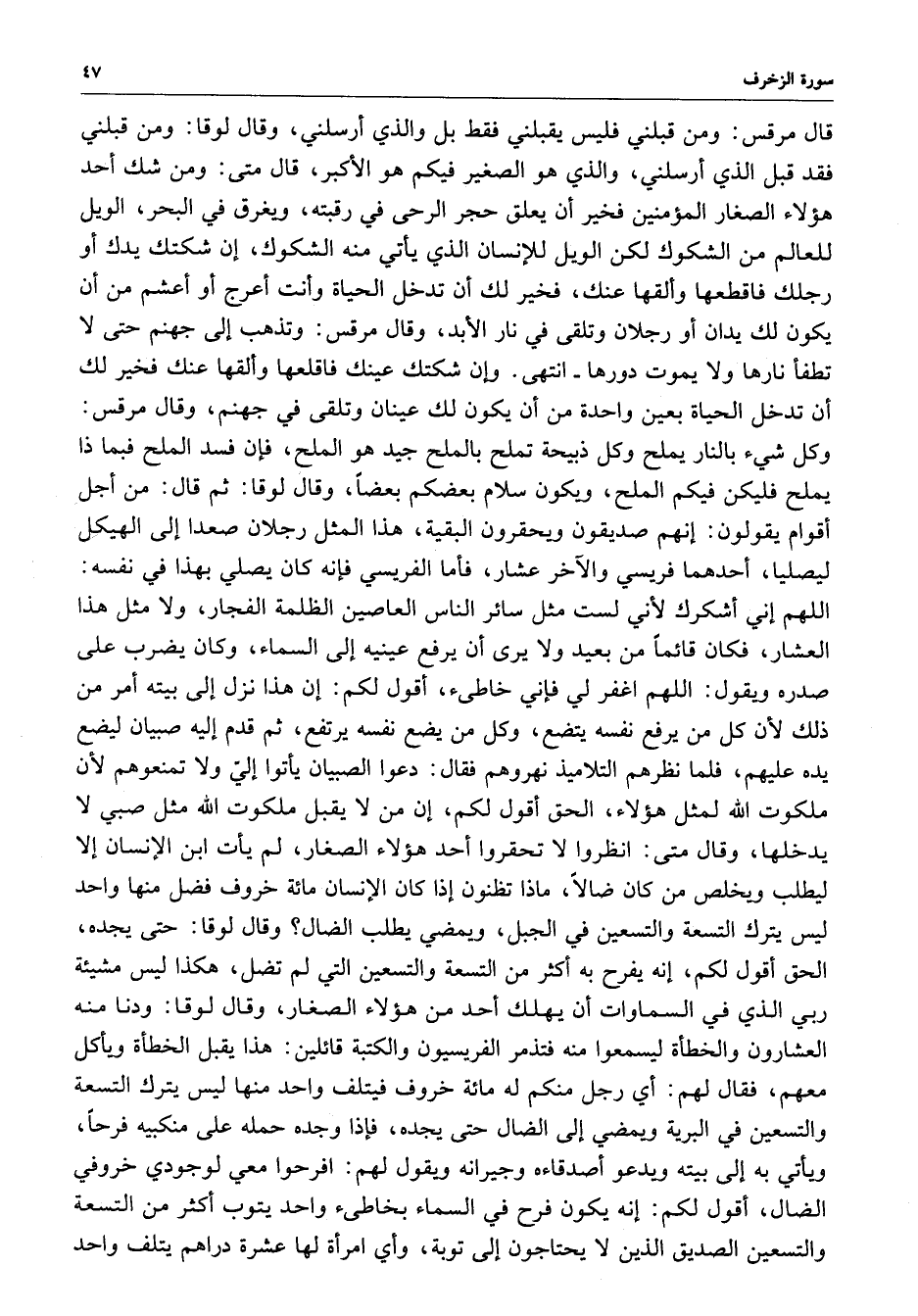 وإن شكتك عينك فاقلعها وألقها عنك فخير لك أن تدخل الحياة بعين واحدة من أن يكون لك عينان وتلقى في جهنم ، وقال مرقس : وكل شيء بالنار يملح وكل ذبيحة تملح بالملح جيد هو الملح ، فإن فسد الملح فبما ذا يملح فليكن فيكم الملح ، ويكون سلام بعضكم بعضاً ، وقال لوقا : ثم قال : من أجل أقوام يقولون : إنهم صديقون ويحقرون البقية ، هذا المثل رجلان صعدا إلى الهيكل ليصليا ، أحدهما فريسي والآخر عشار ، فأما الفريسي فإنه كان يصلي بهذا في نفسه : اللهم إني أشكرك لأني لست مثل سائر الناس العاصين الظلمة الفجار ، ولا مثل هذا العشار ، فكان قائماً من بعيد ولا يرى أن يرفع عينيه إلى السماء ، وكان يضرب على صدره ويقول : اللهم اغفر لي فإني خاطئ ، أقول لكم : إن هذا نزل إلى بيته أمر من ذلك لأن كل من يرفع نفسه يتضع ، ولك من يضع نفسه يرتفع ، ثم قدم إليه صبيان ليضع يده عليهم ، فلما نظرهم التلاميذ نهروهم فقال : دعوا الصبيان يأتوا إليّ ولا تمنعوهم لأن ملكوت الله لمثل هؤلاء ، الحق أقول لكم ، إن من لا يقبل ملكوت الله مثل صبي لا يدخلها ، وقال متى : انظروا لا تحقروا أحد هؤلاء الصغار ، لم يأت ابن الإنسان إلا ليطلب ويخلص من كان ضالاً ، ماذا تظنون إذا كان الإنسان مائة خروف فضل منها واحد ليس يترك التسعة والتسعين في الجبل ، ويمضي يطلب الضال ؟ وقال لوقا : حتى يجده ، الحق أقول لكم ، إنه يفرح به أكثر من التسعة والتسعين التي لم تضل ، هكذا ليس مشيئة ربي الذي في السموات أن يهلك أحد من هؤلاء الصغار ، وقال لوقا : ودنا منه العشارون والخطأة ليسمعوا منه فتذمر الفريسيون والكتبة قائلين : هذا يقبل الخطأة ويأكل معهم ، فقال لهم : أي رجل منكم له مائة خروف فيتلف واحد منها ليس يترك التسعة والتسعين في البرية ويمضي إلى الضال حتى يجده ، فإذا وجده حمله على منكبيه فرحاً ، ويأتي به إلى بيته ويدعو أصدقاءه وجيرانه ويقول لهم : افرحوا معي لوجودي خروفي الضال ، أقول لكم : إنه يكون فرح في السماء بخاطىء واحد يتوب أكثر من التسعة والتسعين الصديق الذين لا يحتاجون إلى توبة ، وأي امرأة لها عشر دراهم يتلف واحد