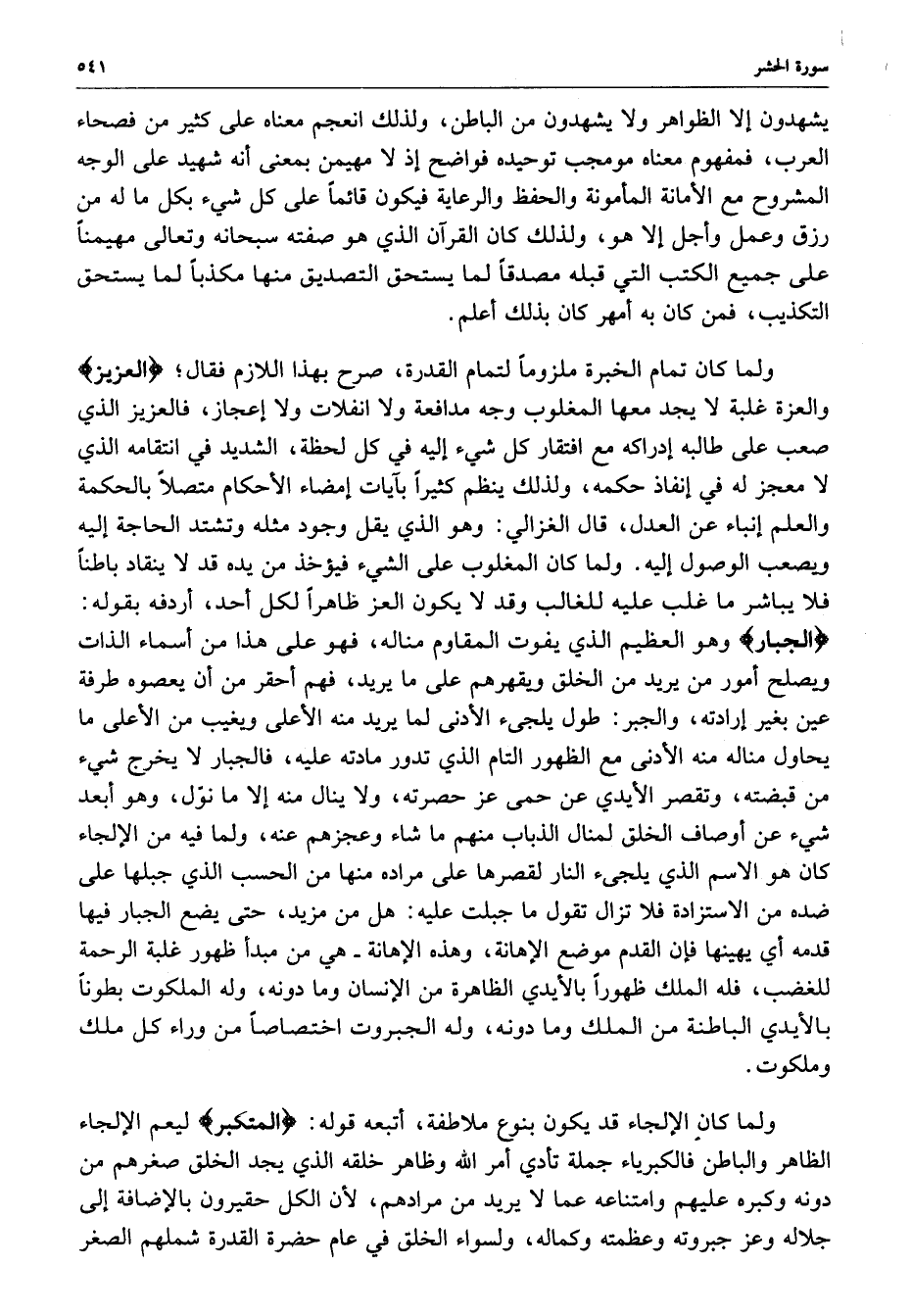 مقصودها بيان ما دل عليه آخر المجادلة من التنزه عن شوائب النقص بإثبات القدرة الشاملة بدليل شهودي على أنه يغلب هو ورسله ، ومن حاده في الأذلين ، لأنه قوي عزيز ، المستلزمة للعلم التام المستلزم الحكمة البالغة المستلزمة للحشر المظهر لفلاح المفلح وخسار الخاسر على زجه الثبات الكاشف أتم كشف لجميع صفات الكمال ، وأدل ما فيها على ذلكط تأمل قصة بني النضير المعلم بأول الحشر المؤذن بالحشر الحقيقي بالقدرة عليه بعد إطباق الولي والعدو على ظن أنه لا يكون ، فلذا سميت الحشر وببني النضير لأنه سبحانه وتعالى حشرهم بقدرته من المدينة الشريفة إلى خيبر والشام والحيرة ثم حشرهم وغيرهم من اليهود الحشر الثاني من خيبر إلى الشام الذي هو آية الحشر الأعظم إلى أرض الحشر لقهر هذا النبي الكريم أهل الكتاب المدعين لأنهم أفضل الناس وأنهم مؤيدون بما لهم من الدين الذي أصله قويم بما لوحت إليه الحديد كما قهر أهل الأوثان الذين هم عالمون بأنهم بدلوا الدين الصحيح فثبتت بظهور دينه على كل دين على حد سواء كما وعد به سبحانه صدقه في كل ما جاء به بعد التوحيد - الإيمان بالبعث الآخر لأنه محط الحكمة وموضع إظهار النقمة والرحمة ) بسم الله ( الملك الأعظم الذي لا راد لأمره فلا خلف لعباده ) الرحمن ( الذي عمت نعمةى إيجاده فلا محيص عن معاده ) الرحيم ( الذي خص أهل وداده بالتوفيق لما يرضيه عنهم فيوجب لهم الفوز بإسعاده .