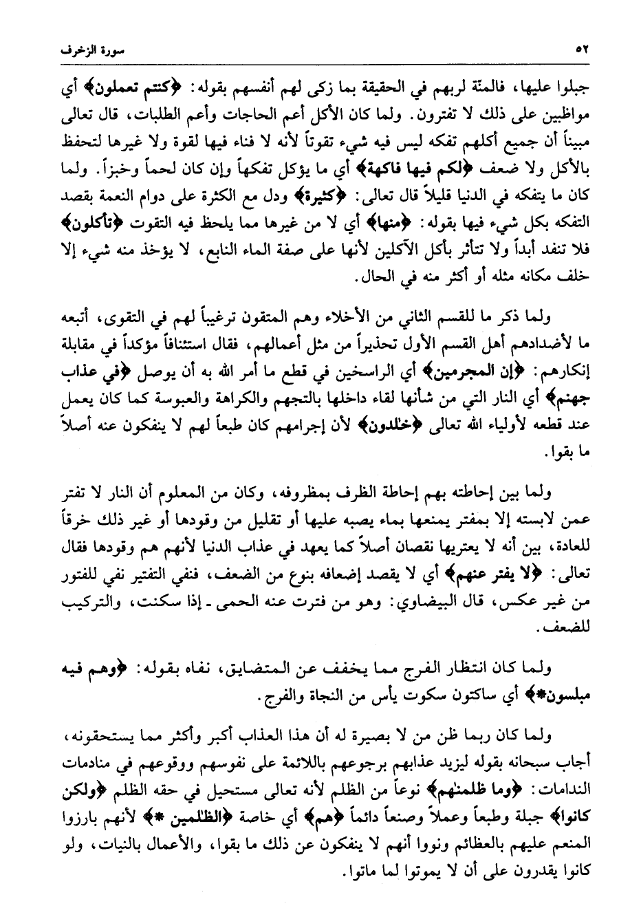 ولما كان ما يتفكه في الدنيا قليلاً قال تعالى : ( كثيرة ( ودل مع الكثرة على دوام النعمة بقصد التفكه بكل شيء فيها بقوله : ( منها ) أي لا من غيرها مما يلحظ فيها التقوت ) تأكلون ( فلا تنفد أبداً ولا تتأثر بأكل الآكلين لأنها على صفة الماء النابع ، لا يؤخذ منه شيء إلا خلف مكانه مثله أو أكثر منه في الحال .