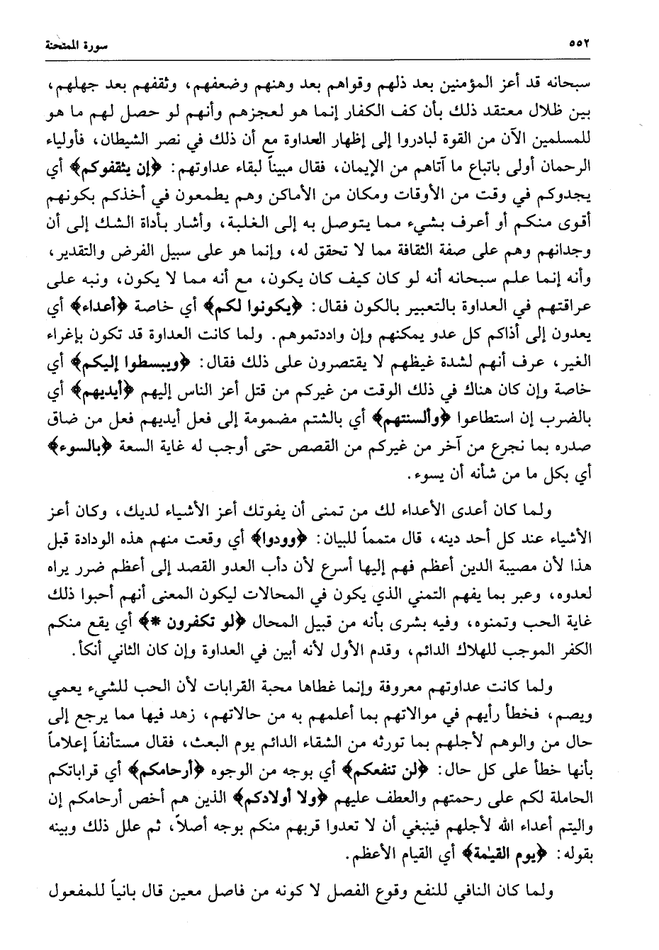 وقال ابن عطية : ما أخذ النبي ( صلى الله عليه وسلم ) لبني النضير ومن فدك فهو خاص بالنبي ( صلى الله عليه وسلم ) ، وليس على حكم الغنيمة التي يوجف عليها ويقاتل فيها ، ومذهب الشافعي رضي الله عنه أن هذه الأموال التي هي فيء كيبقية الفيء يقسم على خمسة أسهم : خمس منها للأصناف المذكورة أولها النبي ( صلى الله عليه وسلم ) وأربعة أخماسها له ( صلى الله عليه وسلم ) وحده ، وأجاب الشافعي عن قول عمر رضي الله عنه ، ( فكانت هذه لرسول الله ( صلى الله عليه وسلم ) خاصة ) بأنه عام أريد به الخاص ، ومعناه ، فكان ما بقي منها في يد رسول الله ( صلى الله عليه وسلم ) بعد إعطاء الخمس لأربابه خاصاً به ( صلى الله عليه وسلم ) ، لا يشك أحد في خصوصيته به ، ثم إنه مع ذلك ما حتازه دونهم بل كان يفعل ما ذكر في الحديث من الإيثار ، قال الشافعي رضي الله عنه : لأنا لا نشك أن النبي ( صلى الله عليه وسلم ) أعطى الأصناف المذكورين في الآية منها حقهم وقد عهدنا أن حق هؤلاء الأصناف من مال المشركين الخمس كما هو صريح في سورة الأنفال ، واستفيد من قول عمر رضي الله عنه ( إنها كانت للنبي ( صلى الله عليه وسلم ) ) أنه كان له ما كان يشترك فيه المسلمون من الخمس من الغنيمة التي حصلت بما حصل للكفار من الرعب منهم ، والذي كان يشترك فيه المسلمون بعد الخمس هو أربعة الأخماس والنبي ( صلى الله عليه وسلم ) قام مقام المسلمين فيه إذ هم لم يوجفوا عليه بخيل ولا ركاب ، وإنما حصل ذلك بالرعب الذي ألقاه الله لرسوله ( صلى الله عليه وسلم ) في قلوب المشركين ، فكانت الأربعة الأخماس تختص ممن كان السبب في حصول الجميع كما في الغنيمة ، فعلى هذا الفيء الغنيمة لا يختلفان في أن الأربعة الأخماس تختص لمن كان السبب في حصول الجميع وأن خمس المالين يكون للأصناف المذكورة ، والذي كان لهد ( صلى الله عليه وسلم ) من الفيء من الأربعة الأخماس يكون بعد موته ( صلى الله عليه وسلم ) للمقاتلة لأنه حصل بالرعب الحاصل للكفار منهم كأربعة أخماس الغنيمة التي حصلت بقتالهم .