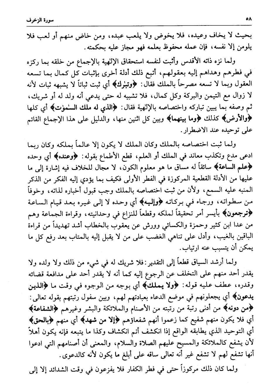 لما ثبت اختصاصه بالملك وكان الملك لا يكون إلا عالماً بملكه وكان ربما ادعى مدع وتكذب معاند في الملك أو العلم ، قطع الأطماع بقوله : ( وعنده ) أي وحده ) علم الساعة ( سائقاً له مساق ما هو معلوم الكون ، لا مجال للخلاف فيه إشارة إلى ما عليها من الأدلة القطعية المركوزة في الفطرة الأولى فكيف يما يؤدي إليه الفكر من الذكر المنبه عليه السمع ، ولأن من ثبت اختصاصه بالملك وجب قبول أخباره لذاته ، وخوفاً من سطواته ، ورجاء في بركاته ) وإليه ) أي وحده لا إلى غيره بعد قيام الساعة ) ترجعون ( بأيسر أمر تحقيقاً لملكه وقطعاً للنزاع في وحدانيته ، وقراءة الجماعة وهم من عدا ابن كثير وحمزة والكسائي وورش عن يعقوب بالخطاب أشد تهديداً من قراءة الباقين بالغيب ، وأدل على تناهي الغضب على من لا يقبل إليه بالمتاب بعد رفع كل ما يمكن أن يتسبب عنه ارتياب .