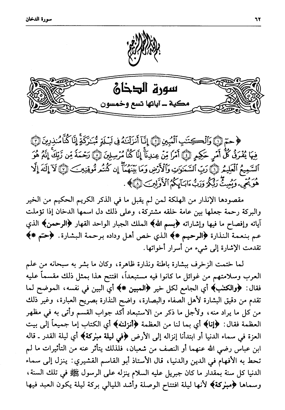 ) حم وَالْكِتَابِ الْمُبِينِ إِنَّآ أَنزَلْنَاهُ فِي لَيْلَةٍ مُّبَارَكَةٍ إِنَّا كُنَّا مُنذِرِينَ فِيهَا يُفْرَقُ كُلُّ أَمْرٍ حَكِيمٍ أَمْراً مِّنْ عِنْدِنَآ إِنَّا كُنَّا مُرْسِلِينَ رَحْمَةً مِّن رَّبِّكَ إِنَّهُ هُوَ السَّمِيعُ الْعَلِيمُ رَبِّ السَّمَاوَاتِ وَالأَرْضِ وَمَا بَيْنَهُمَآ إِن كُنتُم مُّوقِنِينَ لاَ إِلَهَ إِلاَّ هُوَ يُحْيِي وَيُمِيتُ رَبُّكُمْ وَرَبُّ آبَآئِكُمُ الأَوَّلِينَ ( ( )