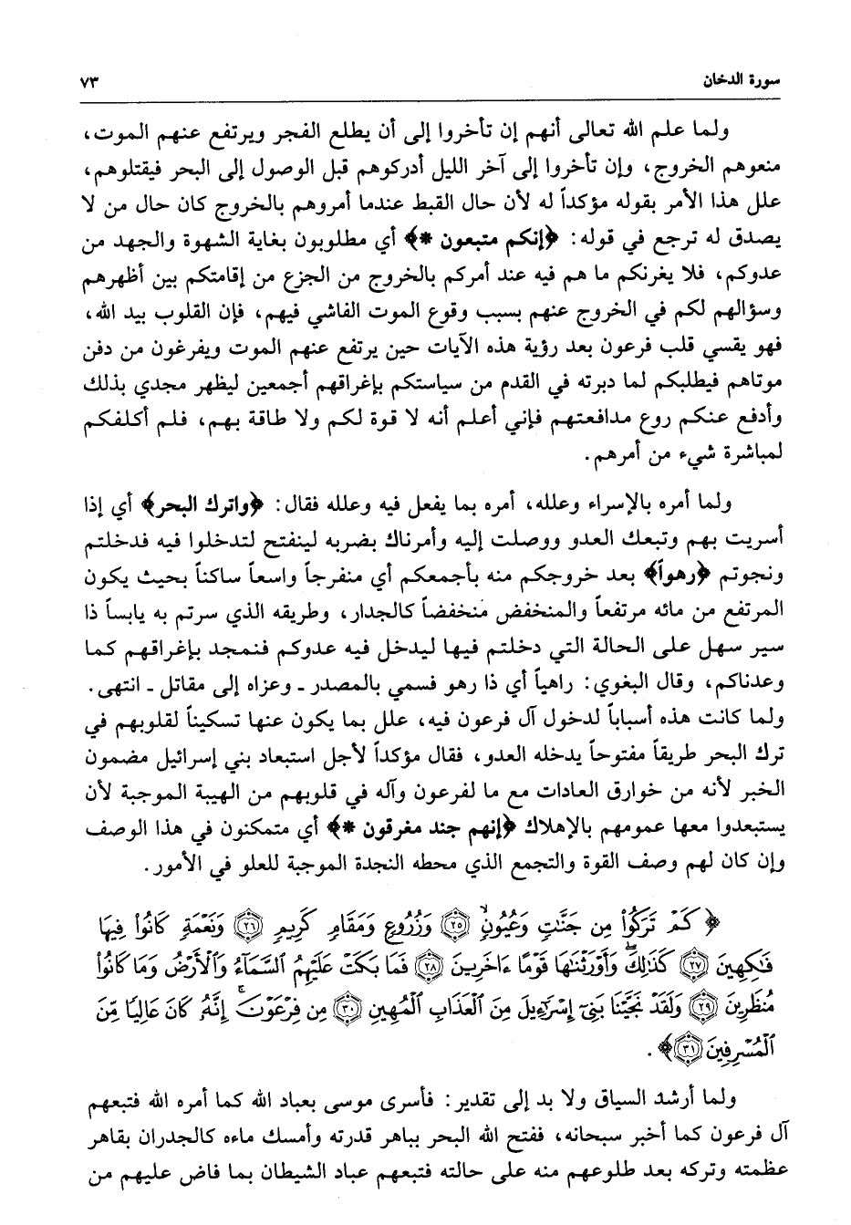 ) كَمْ تَرَكُواْ مِن جَنَّاتٍ وَعُيُونٍ وَزُرُوعٍ وَمَقَامٍ كَرِيمٍ وَنَعْمَةٍ كَانُواْ فِيهَا فَاكِهِينَ كَذَلِكَ وَأَوْرَثْنَاهَا قَوْماً آخَرِينَ فَمَا بَكَتْ عَلَيْهِمُ السَّمَآءُ وَالأَرْضُ وَمَا كَانُواْ مُنظَرِينَ وَلَقَدْ نَجَّيْنَا بَنِي إِسْرَائِيلَ مِنَ الْعَذَابِ الْمُهِينِ مِن فِرْعَوْنَ إِنَّهُ كَانَ عَالِياً مِّنَ الْمُسْرِفِينَ ( ( )