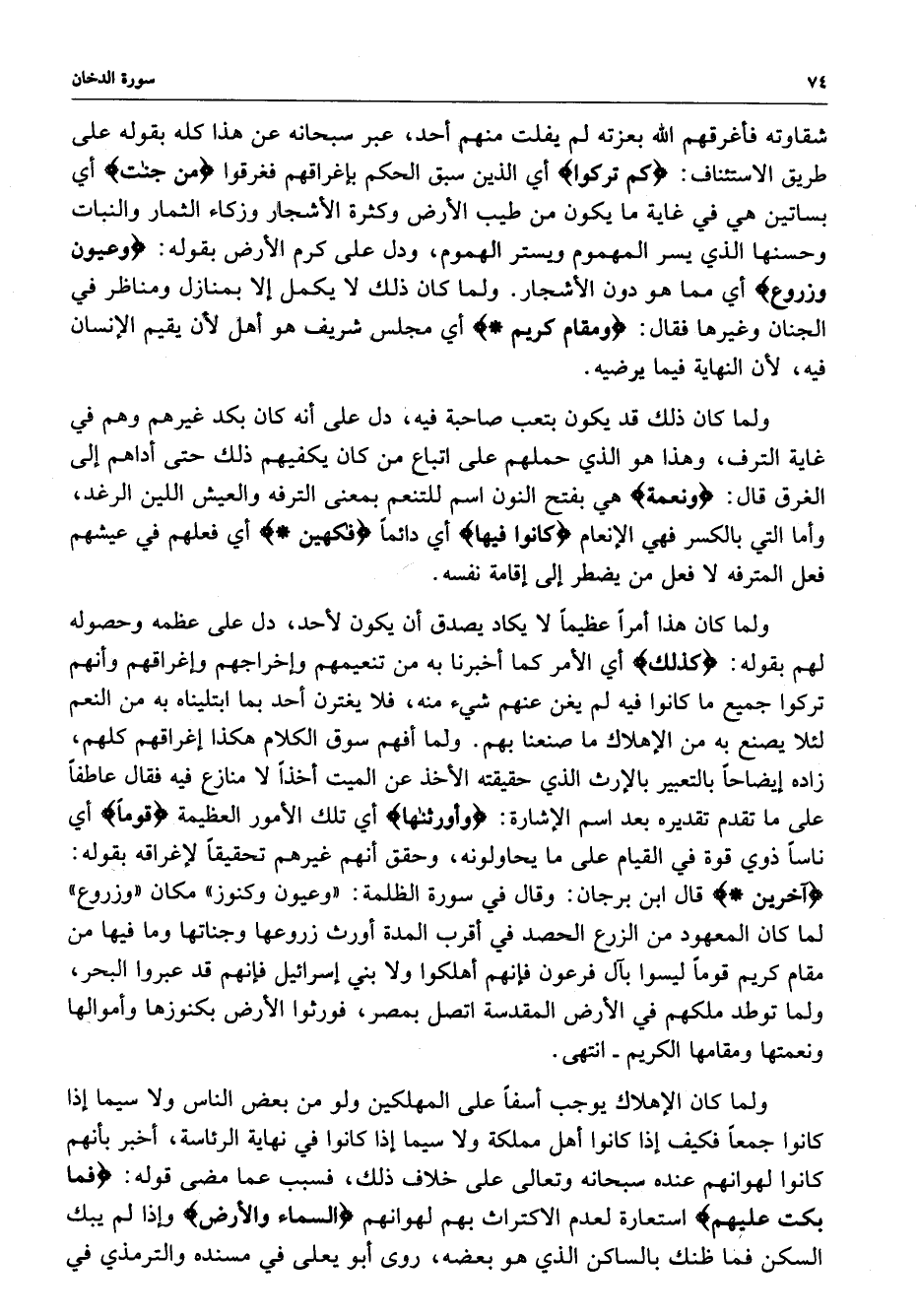 ولما كان الإهلاك يوجب أسفاً على المهلكين ولو من بعض الناس ولا سيما إذا كانوا جمعاً فكيف إذا كانوا أهل مملكة ولا سيمنا إذا كانوا في نهاية الرئاسة ، أخبر بأنهم كانوا لهوانهم عنده سبحانه وتعالىعلى خلاف ذلك ، فسبب عما مضى قوله : ( فما بكت عليهم ( استعارة لعدم الاكتراث لهم لهوانهم ) السماء والأرض ( وإذا لم يبك السكن فما ظنك بالساكن الذي هو بعضه ، روى أبو يعلى في مسنده والترمذي في