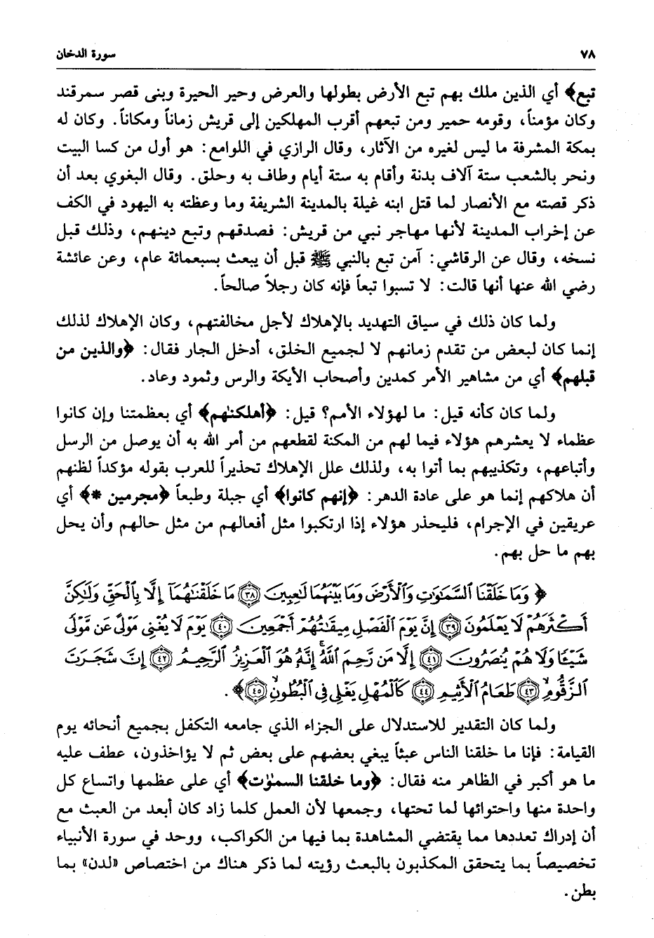) وَمَا خَلَقْنَا السَّمَاوَاتِ وَالأَرْضَ وَمَا بَيْنَهُمَا لاَعِبِينَ مَا خَلَقْنَاهُمَآ إِلاَّ بِالْحَقِّ وَلَكِنَّ أَكْثَرَهُمْ لاَ يَعْلَمُونَ إِنَّ يَوْمَ الْفَصْلِ مِيقَاتُهُمْ أَجْمَعِينَ يَوْمَ لاَ يُغْنِي مَوْلًى عَن مَّوْلًى شَيْئاً وَلاَ هُمْ يُنصَرُونَ إِلاَّ مَن رَّحِمَ اللَّهُ إِنَّهُ هُوَ الْعَزِيزُ الرَّحِيمُ إِنَّ شَجَرَةَ الزَّقُّومِ طَعَامُ الأَثِيمِ كَالْمُهْلِ يَغْلِي فِي الْبُطُونِ ( ( )