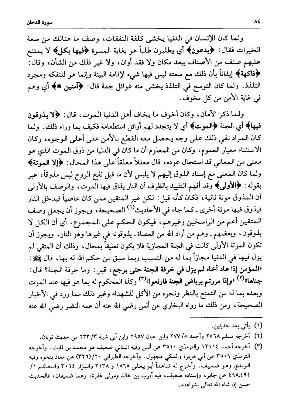 ولما كان المراد نفي ذلك على وجه يحصل معه القطع بالأمن على أعلى الوجوه ، وكان الاستثناء معيار العموم ، وكان من المعلوم أن ما كان في الدنيا من ذوق الموت الذي هو معنى من المعاني قد استحال عوده ، قال معللاً معلقاً على هذا المحال : ( إلا الموتة ( ولما كان المعنى مع إسناد الذوق إليه لا يلبس لأن ما قبل نفخ الروح ليس مذوقاً ، عبر بقوله : ( الأولى ( وقد أفهم التقييد بالظرف أن النار يذاق فيها الموت ، والوصف بالأولى أن المذوق موتة ثانية ، فكان كأنه قيل : لكن غير المتقين ممن كان عاصياً فيدخل النار المتقين أعم من الراسخين وغيرهم ، فيكون الحكم على المجموع ، أي أن الكل لا يذوقون ، وبعضهم - وهم من أراد الله من العصاة - يذوقونه في غيرها وهو النار ، ويجوز أن تكون الموتة الأولى كانت في الجنة المجازية فلا يكون تعليقاً بمحال ، وذلك أن المتقي لم يزل فيها في الدنيا مجازاً بما له من التسبب وبما سبق من حكم الله له بها ، قال ( صلى الله عليه وسلم ) : ( المؤمن إذا عاد أخاه لم يزل في خرفة الجنة حتى يرجع ) ، قيل : وما خرفة الجنة ؟ قال : ( جناها ) ( وإذا مررتم برياض الجنة فارتعوا ) وكذا المحكوم له بما هو فيها عند الموت وبعده بما له من التمتع بالنظر ونحوه من الأكل للشهداء وغير ذلك مما ورد في الأخبار الصحيحة ، ومن ذلك ما رواه البخاري عن أنس رضي الله عنه أن عمه النضر رضي الله عنه
