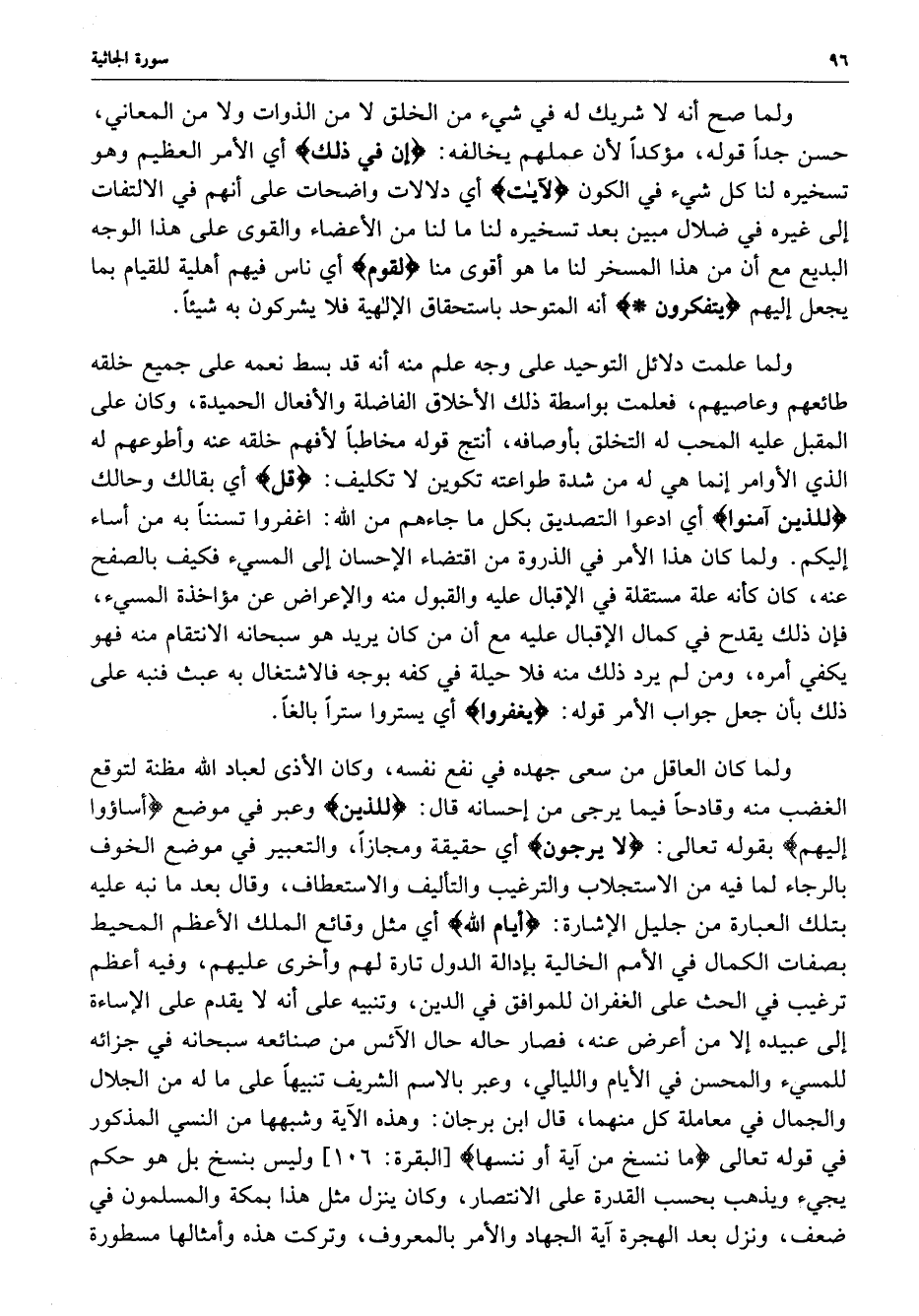 ولما علمت دلائل التوحيد على وجه علم منه أنه قد بسط نعمه على جميع خلقه طائعهم وعاصيهم ، فعلمت بواسطة ذلك الأخلاق الفاضلة والأفعال الحميدة ، وكان على المقبل عليه المحب له التخلق بأوصافه ، أنتج قوله مخاطباً لأفهم خلقه عنه وأطوعهم له الذي الأوامر إنما هي له من شدة طواعته تكوين لا تكليف : ( قل ) أي بقالك وحالك ) للذين آمنوا ) أي ادعوا التصديق بكل ما جاءهم من الله : اغفروا تسنناً به من أساء إليكم .