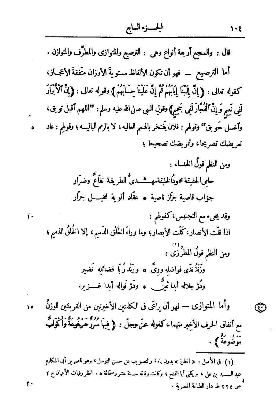 قال: والسجع أربعة أنواع وهى: الترصيع والمتوازى والمطرّف والمتوازن.