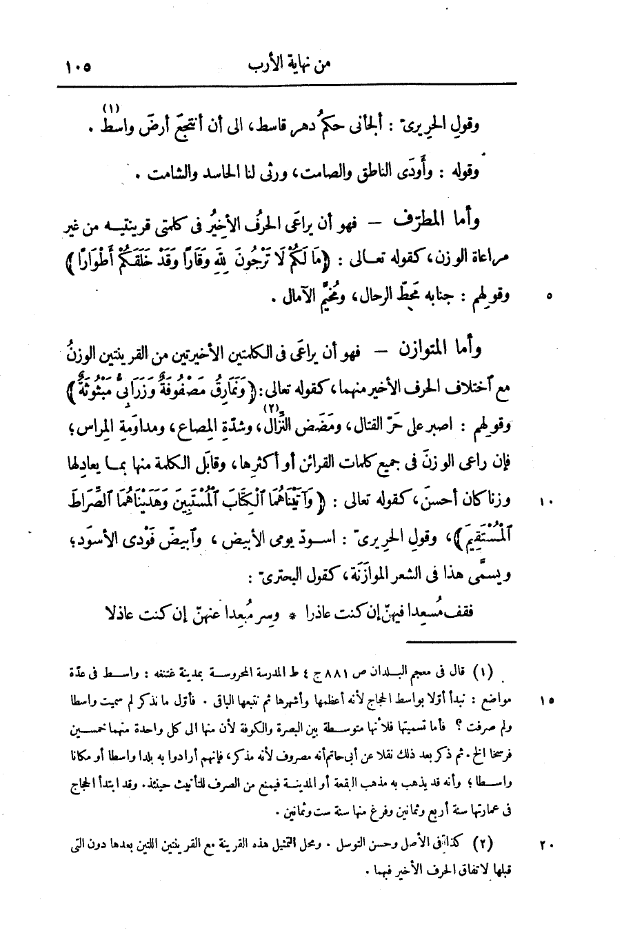 وقولهم: اصبر على حرّ القتال، ومضض النّزال «2» ، وشدّة المصاع، ومداومة المراس؛ فإن راعى الوزن فى جميع كلمات القرائن أو أكثرها، وقابل الكلمة منها بما يعادلها وزنا كان أحسن، كقوله تعالى: وَآتَيْناهُمَا الْكِتابَ الْمُسْتَبِينَ وَهَدَيْناهُمَا الصِّراطَ الْمُسْتَقِيمَ