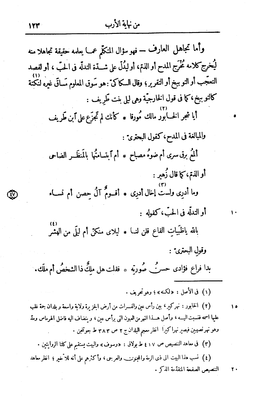 - فهو سؤال المتكلّم عما يعلمه حقيقة تجاهلا منه ليخرج كلامه مخرج المدح أو الذمّ، أو ليدلّ على شدّة التدلّه فى الحبّ، أو لقصد التعجّب أو التوبيخ أو التقرير؛ وقال السكاكىّ: هو سوق المعلوم مساق غيره لنكتة «1» كالتوبيخ، كما فى قول الخارجيّة وهى ليلى بنت طريف: