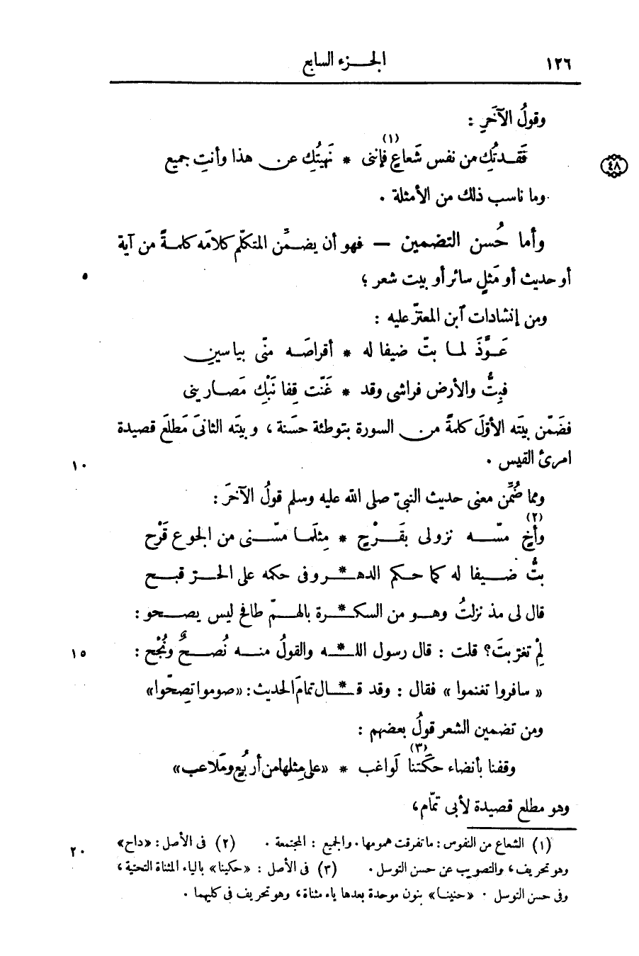 فضمّن بيته الأوّل كلمة من السورة بتوطئة حسنة، وبيته الثانى مطلع قصيدة امرئ القيس.