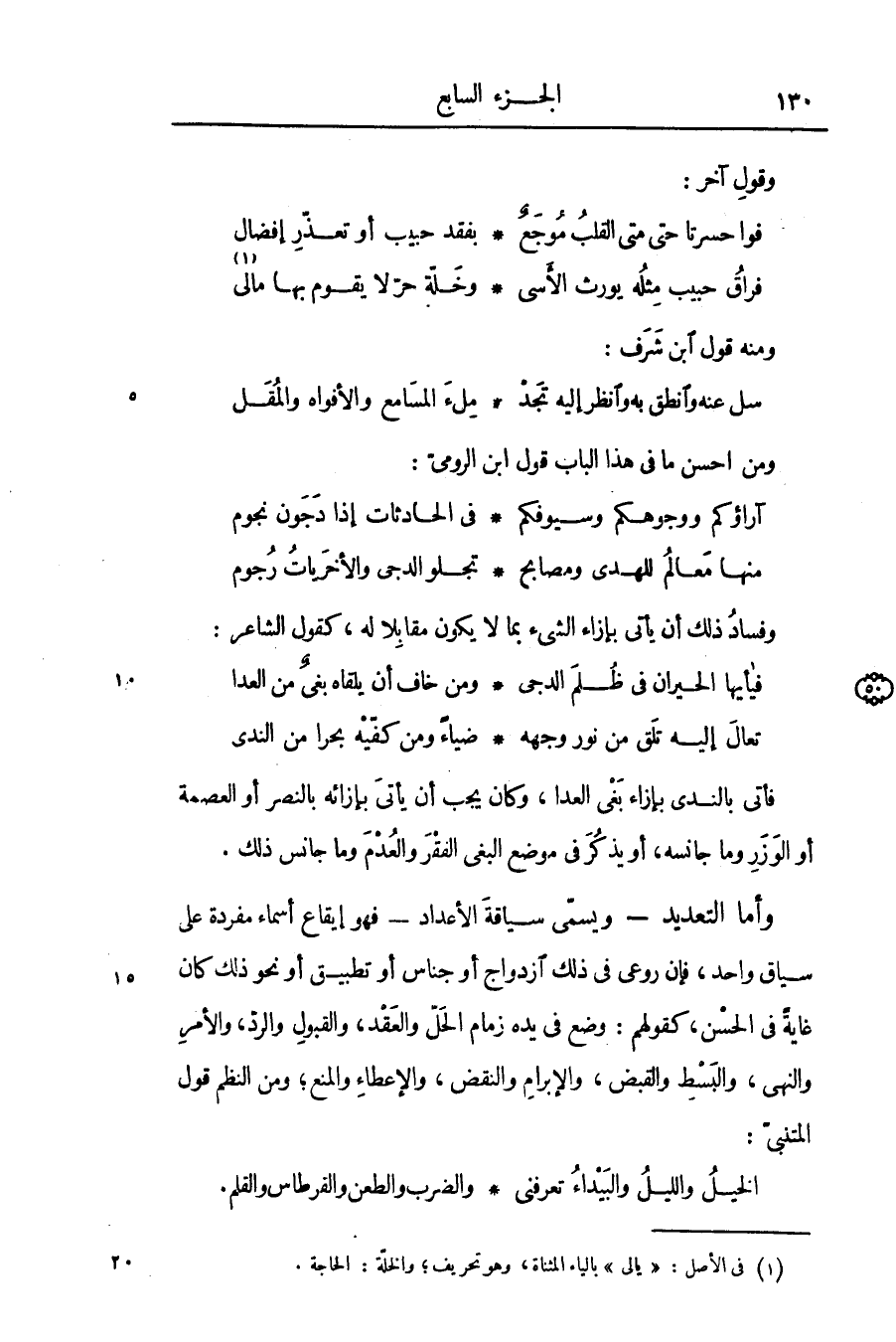 - ويسمّى سياقة الأعداد- فهو إيقاع أسماء مفردة على سياق واحد، فإن روعى فى ذلك ازدواج أو جناس أو تطبيق أو نحو ذلك كان غاية فى الحسن، كقولهم: وضع فى يده زمام الحلّ والعقد، والقبول والردّ، والأمر والنهى، والبسط والقبض، والإبرام والنقض، والإعطاء والمنع؛ ومن النظم قول المتنبىّ: