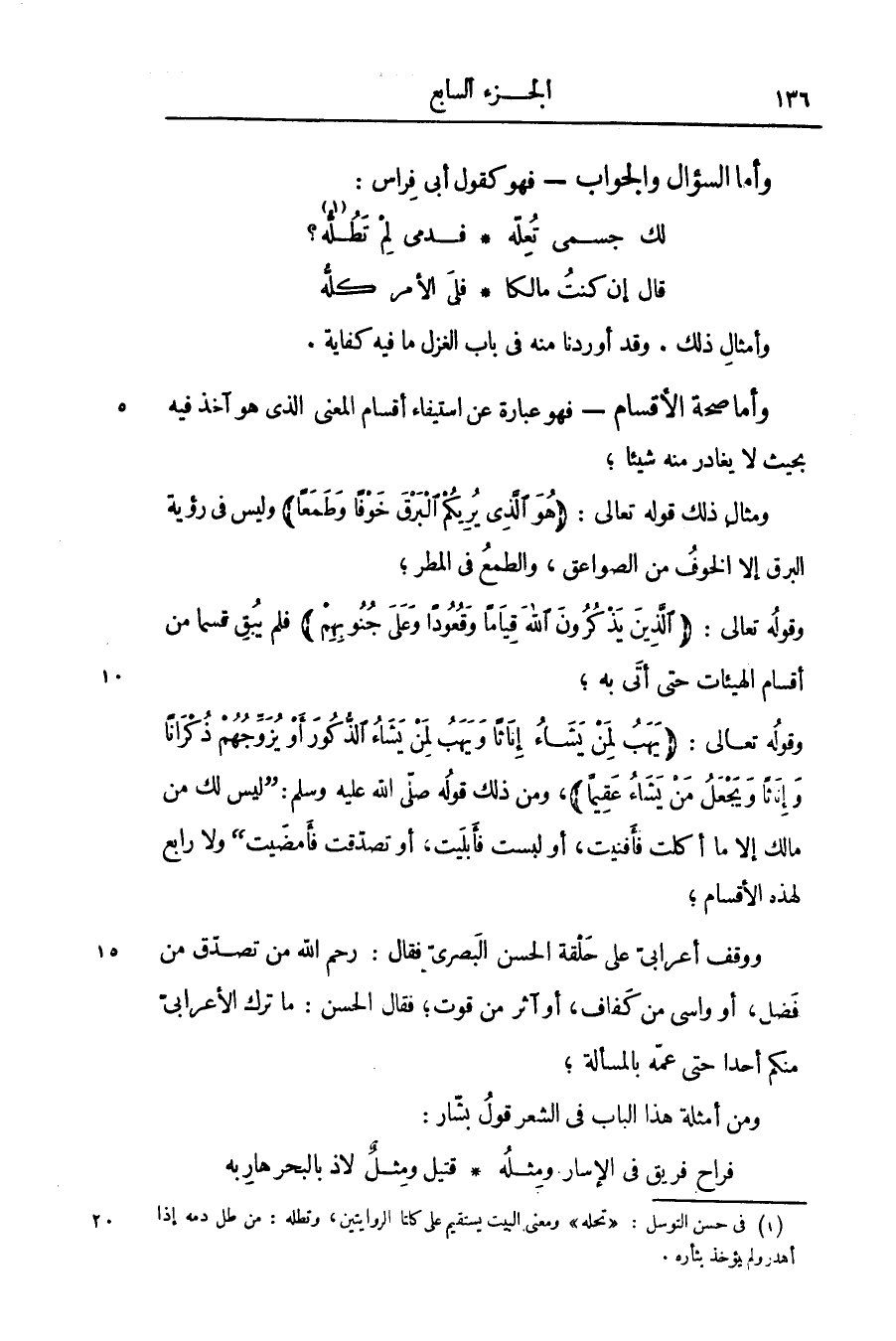، ومن ذلك قوله صلّى الله عليه وسلم: «ليس لك من مالك إلا ما أكلت فأفنيت، أو لبست فأبليت، أو تصدّقت فأمضيت» ولا رابع لهذه الأقسام؛ ووقف أعرابىّ على حلقة الحسن البصرىّ فقال: رحم الله من تصدّق من فضل، أو واسى من كفاف، أو آثر من قوت؛ فقال الحسن: ما ترك الأعرابىّ منكم أحدا حتى عمّه بالمسألة؛ ومن أمثلة هذا الباب فى الشعر قول بشّار: