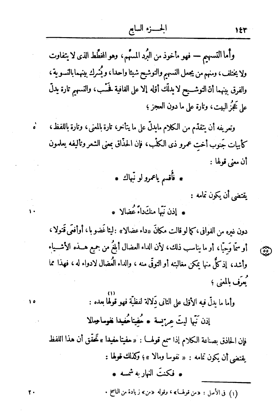 - فهو مأخوذ من البرد المسهّم، وهو المخطّط الذى لا يتفاوت ولا يختلف، ومنهم من يجعل التسهيم والتوشيح شيئا واحدا، ويشرك بينهما بالتسوية، والفرق بينهما أنّ التوشيح لا يدلّك أوّله إلا على القافية فحسب، والتسهيم تارة يدلّ على عجز البيت، وتارة على ما دون العجز؛ وتعريفه أن يتقدّم من الكلام ما يدلّ على ما يتأخر، تارة بالمعنى، وتارة باللفظ، كأبيات جنوب أخت عمرو ذى الكلب، فإن الحذّاق بمعنى الشعر وتأليفه يعلمون أن معنى قولها: