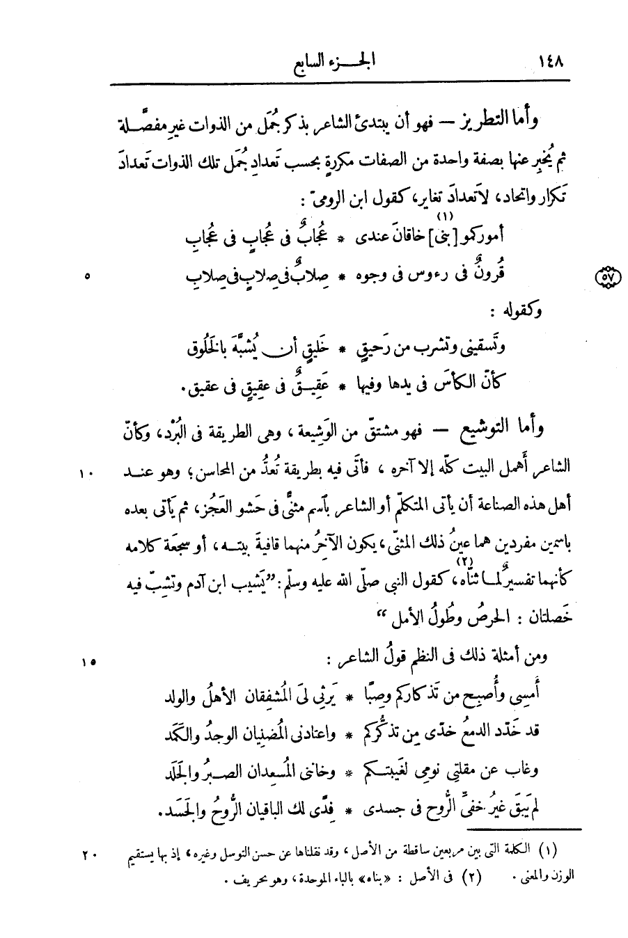 - فهو مشتقّ من الوشيعة، وهى الطريقة فى البرد، وكأنّ الشاعر أهمل البيت كلّه إلا آخره، فأتى فيه بطريقة تعدّ من المحاسن؛ وهو عند أهل هذه الصناعة أن يأتى المتكلّم أو الشاعر باسم مثنّى فى حشو العجز، ثم يأتى بعده باسمين مفردين هما عين ذلك المثنّى، يكون الآخر منهما قافية بيته، أو سجعة كلامه كأنهما تفسير لما ثنّاه «2» ، كقول النبى صلّى الله عليه وسلّم: «يشيب ابن آدم وتشبّ فيه خصلتان: الحرص وطول الأمل» ومن أمثلة ذلك فى النظم قول الشاعر: