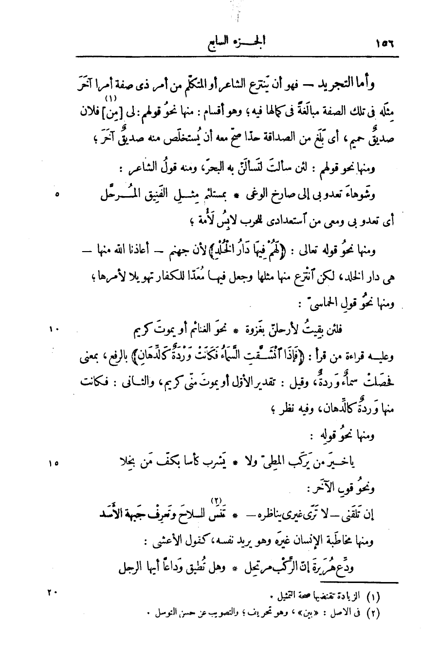 فهو أن ينتزع الشاعر أو المتكلّم من أمر ذى صفة أمرا آخر مثله فى تلك الصفة مبالغة فى كمالها فيه؛ وهو أقسام: منها نحو قولهم: لى [من «1» ] فلان صديق حميم، أى بلغ من الصداقة حدّا صحّ معه أن يستخلص منه صديق آخر؛ ومنها نحو قولهم: لئن سألت لتسألنّ به البحر، ومنه قول الشاعر: