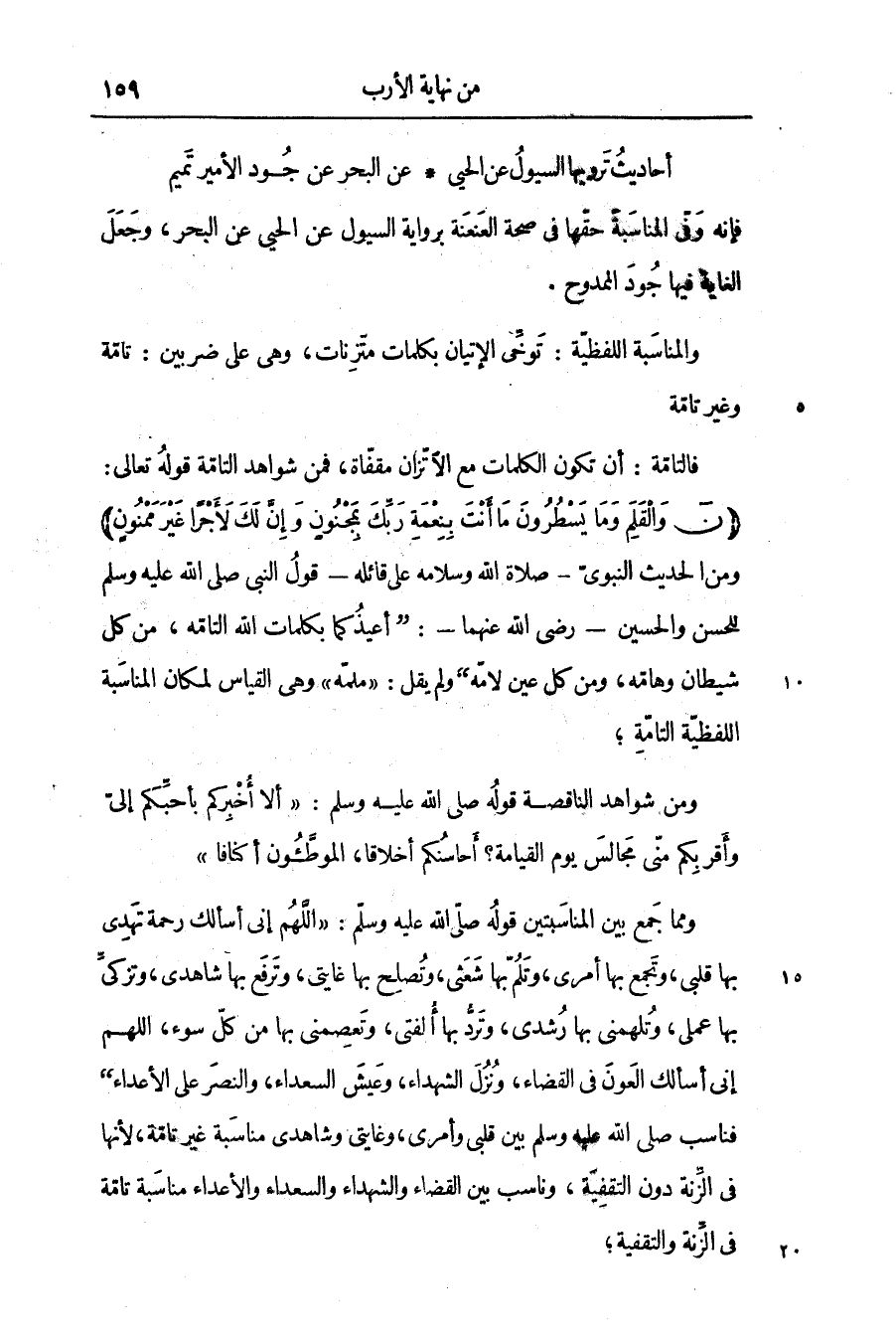 ومن الحديث النبوىّ- صلاة الله وسلامه على قائله- قول النبى صلّى الله عليه وسلم للمحسن والحسين- رضى الله عنهما-: «أعيذكما بكلمات الله التامّة، من كل شيطان وهامّه، ومن كل عين لامّه» ولم يقل: «ملمّه» وهى القياس لمكان المناسبة اللفظيّة التامّة؛ ومن شواهد الناقصة قوله صلّى الله عليه وسلم: «ألا أخبركم بأحبّكم إلىّ وأقربكم منّى مجالس يوم القيامة؟ أحاسنكم أخلاقا، الموطّئون أكنافا» ومما جمع بين المناسبتين قوله صلّى الله عليه وسلم: «اللهم إنى أسألك رحمة تهدى بها قلبى، وتجمع بها أمرى، وتلمّ بها شعثى، وتصلح بها غايتى، وترفع بها شاهدى، وتزكىّ بها عملى، وتلهمنى بها رشدى، وتردّ بها ألفتى، وتعصمنى بها من كلّ سوء، اللهم إنى أسألك العون فى القضاء، ونزل الشهداء، وعيش السعداء، والنصر على الأعداء» فناسب صلّى الله عليه وسلم بين قلبى وأمرى، وغايتى وشاهدى مناسبة غير تامّة، لأنها فى الزّنة دون التقفية، وناسب بين القضاء والشهداء والسعداء والأعداء مناسبة تامّة فى الزّنة والتقفية؛