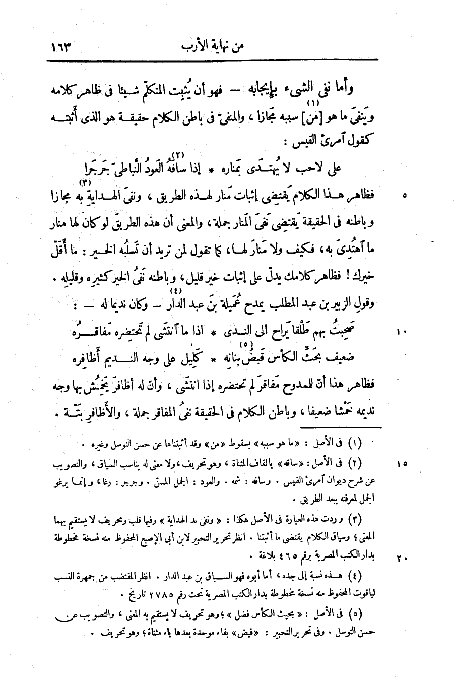 فظاهر هذا أنّ للممدوح مفاقر لم تحتضره إذا انتشى، وأنّ له أظافر يخمش بها وجه نديمه خمشا ضعيفا، وباطن الكلام فى الحقيقة نفى المفاقر جملة، والأظافر بتّة.