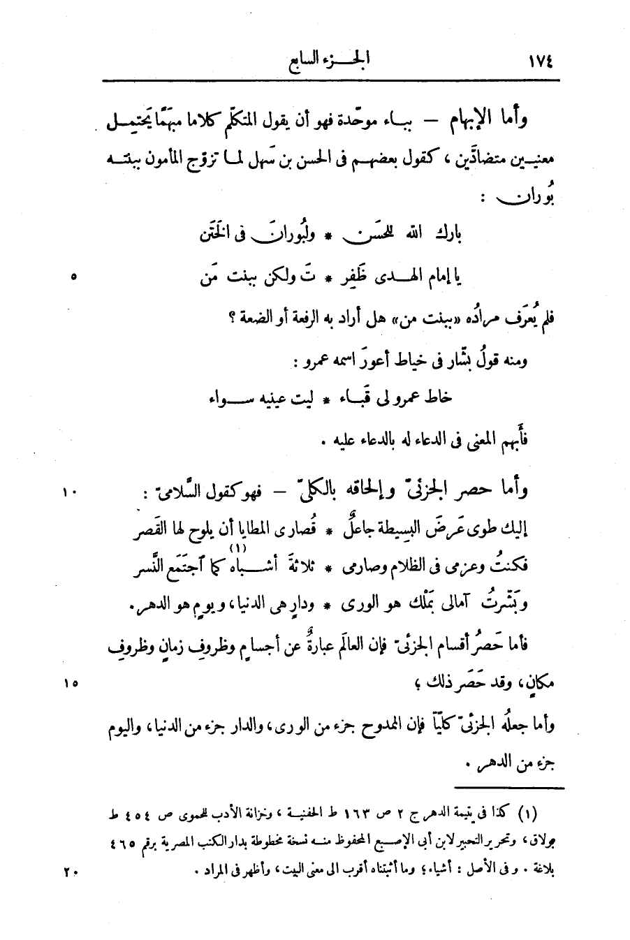 فأما حصر أقسام الجزئىّ فإن العالم عبارة عن أجسام وظروف زمان وظروف مكان، وقد حصر ذلك؛ وأما جعله الجزئىّ كلّيّا فإن الممدوح جزء من الورى، والدار جزء من الدنيا، واليوم جزء من الدهر.
