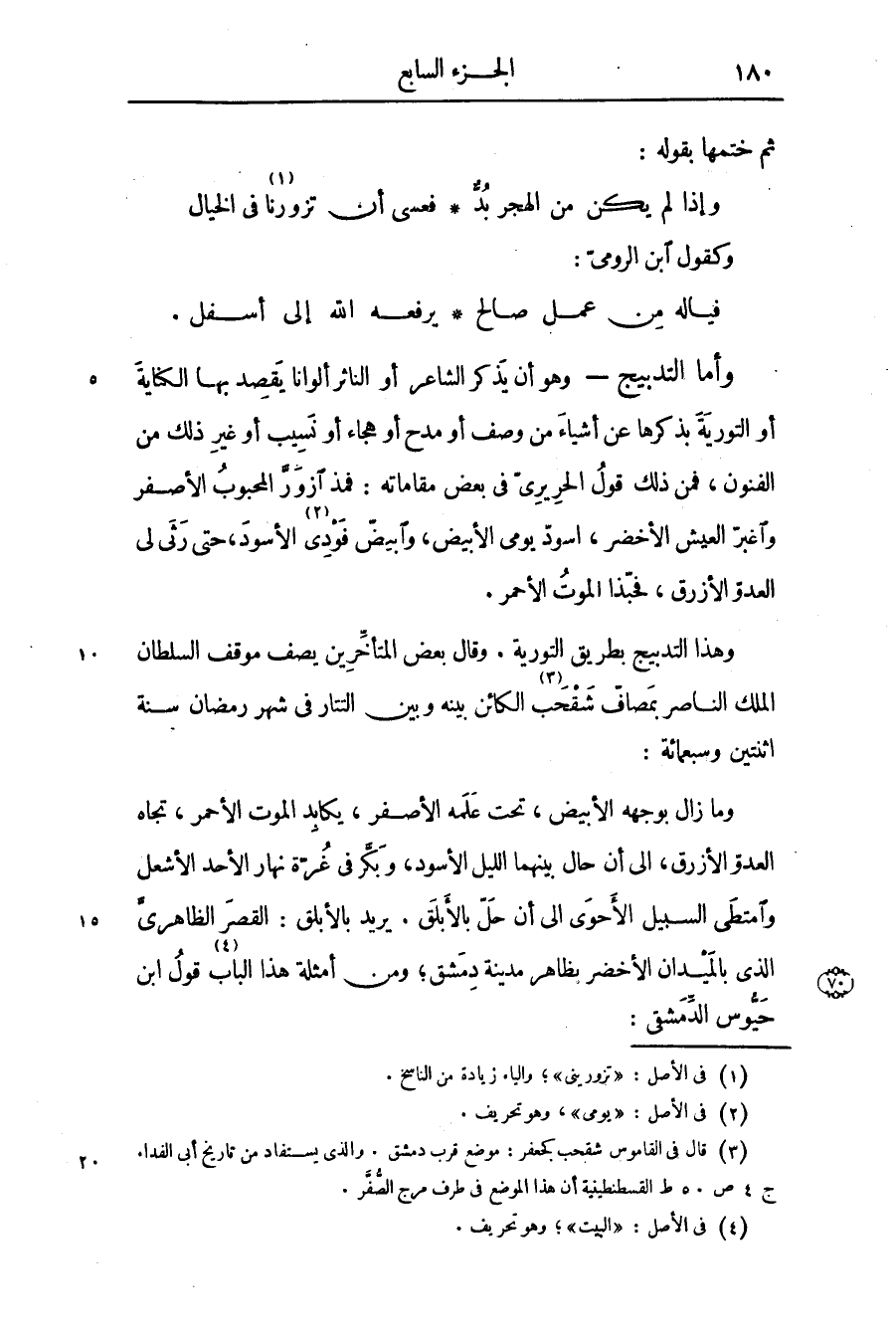 وما زال بوجهه الأبيض، تحت علمه الأصفر، يكابد الموت الأحمر، تجاه العدوّ الأزرق، الى أن حال بينهما الليل الأسود، وبكّر فى غرّة نهار الأحد الأشعل وامتطى السبيل الأحوى الى أن حلّ بالأبلق. يريد بالأبلق: القصر الظاهرىّ الذى بالميدان الأخضر بظاهر مدينة دمشق؛ ومن أمثلة هذا الباب «4» قول ابن حيّوس الدّمشقى: