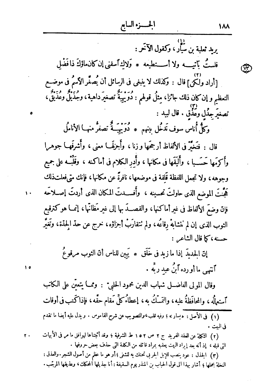 [أراد ولكن «2» ] قال: وكذلك لا ينبغى فى الرسائل أن يصغّر الاسم فى موضع التعظيم وإن كان ذلك جائزا، مثل قولهم: دويهية تصغير داهية، وجذيل وعذيق، تصغير جذل وعذق «3» . قال لبيد: