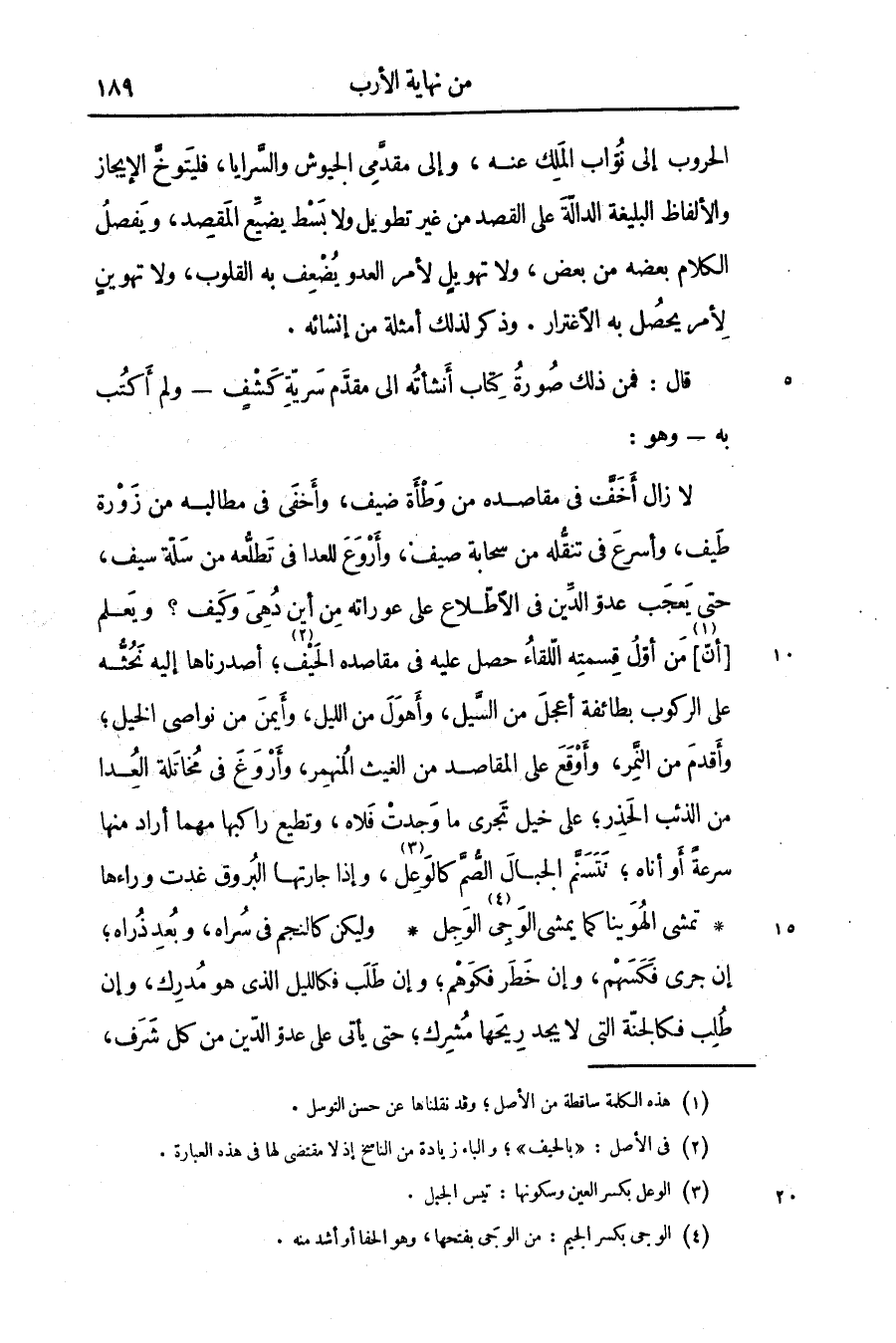 لا زال أخفّ فى مقاصده من وطأة ضيف، وأخفى فى مطالبه من زورة طيف، وأسرع فى تنقّله من سحابة صيف، وأروع للعدا فى تطلّعه من سلّة سيف، حتى يعجب عدوّ الدّين فى الاطّلاع على عوراته من أين دهى وكيف؟ ويعلم [أنّ «1» ] من أوّل قسمته الّلقاء حصل عليه فى مقاصده الحيف «2» ؛ أصدرناها إليه نحثّه على الركوب بطائفة أعجل من السّيل، وأهول من الليل، وأيمن من نواصى الخيل؛ وأقدم من النّمر، وأوقع على المقاصد من الغيث المنهمر، وأروغ فى مخاتلة العدا من الذئب الحذر؛ على خيل تجرى ما وجدت فلاه، وتطيع راكبها مهما أراد منها سرعة أو أناه؛ تتسنّم الجبال الصّمّ كالوعل «3» ، وإذا جارتها البروق غدت وراءها