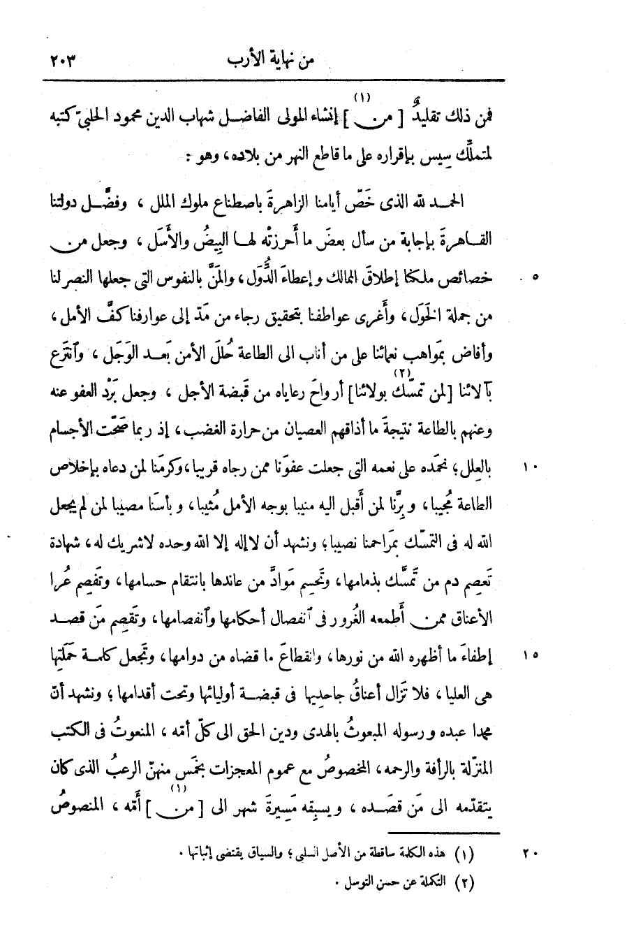 الحمد لله الذى خصّ أيامنا الزاهرة باصطناع ملوك الملل، وفضّل دولتنا القاهرة بإجابة من سأل بعض ما أحرزته لها البيض والأسل، وجعل من خصائص ملكنا إطلاق الممالك وإعطاء الدّول، والمنّ بالنفوس التى جعلها النصر لنا من جملة الخول، وأغرى عواطفنا بتحقيق رجاء من مدّ إلى عوارفنا كفّ الأمل، وأفاض بمواهب نعمائنا على من أناب الى الطاعة حلل الأمن بعد الوجل، وانتزع بآلائنا [لمن تمسّك «2» بولائنا] أرواح رعاياه من قبضة الأجل، وجعل برد العفو عنه وعنهم بالطاعة نتيجة ما أذاقهم العصيان من حرارة الغضب، إذ ربما صحّت الأجسام بالعلل؛ نحمده على نعمه التى جعلت عفونا ممن رجاه قريبا، وكرمنا لمن دعاه بإخلاص الطاعة مجيبا، وبرّنا لمن أقبل اليه منيبا بوجه الأمل مثيبا، وبأسنا مصيبا لمن لم يجعل الله له فى التمسّك بمراحمنا نصيبا؛ ونشهد أن لا إله إلا الله وحده لا شريك له، شهادة تعصم دم من تمسّك بذمامها، وتحسم موادّ من عاندها بانتقام حسامها، وتفصم عرا الأعناق ممن أطمعه الغرور فى انفصال أحكامها وانفصامها، وتقصم من قصد إطفاء ما أظهره الله من نورها، وانقطاع ما قضاه من دوامها، وتجعل كلمة حملتها هى العليا، فلا تزال أعناق جاحديها فى قبضة أوليائها وتحت أقدامها؛ ونشهد أنّ محمدا عبده ورسوله المبعوث بالهدى ودين الحق الى كلّ أمّه، المنعوت فى الكتب المنزّلة بالرأفة والرحمه، المخصوص مع عموم المعجزات بخمس منهنّ الرعب الذى كان يتقدّمه الى من قصده، ويسبقه مسيرة شهر الى [من «3» ] أمّه، المنصوص