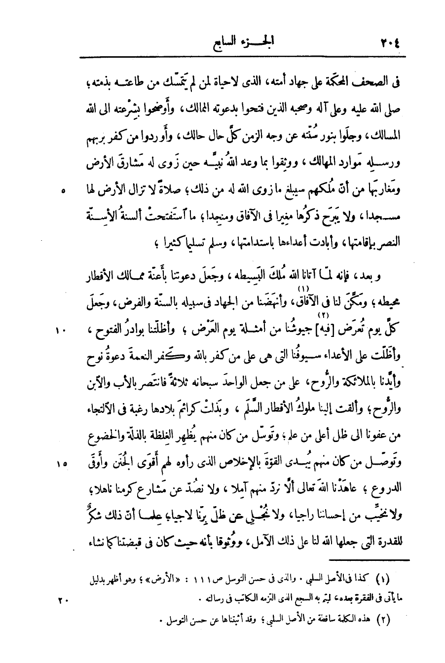 فى الصحف المحكمة على جهاد أمته، الذى لا حياة لمن لم يتمسّك من طاعته بذمته؛ صلّى الله عليه وعلى آله وصحبه الذين فتحوا بدعوته الممالك، وأوضحوا بشرعته الى الله المسالك، وجلوا بنور سنّته عن وجه الزمن كلّ حال حالك، وأوردوا من كفر بربهم ورسله موارد المهالك، ووثقوا بما وعد الله نبيّه حين زوى له مشارق الأرض ومغاربها من أنّ ملكهم سيبلغ ما زوى الله له من ذلك؛ صلاة لا تزال الأرض لها مسجدا، ولا يبرح ذكرها مغيرا فى الآفاق ومنجدا؛ ما استفتحت ألسنة الأسنّة النصر بإقامتها، وأبادت أعداءها باستدامتها، وسلم تسليما كثيرا؛ وبعد، فإنه لمّا آتانا الله ملك البسيطه، وجعل دعوتنا بأعنّة ممالك الأقطار محيطه؛ ومكّن لنا فى الآفاق «1» ، وأنهضنا من الجهاد فى سبيله بالسنّة والفرض، وجعل كلّ يوم تعرض [فيه «2» ] جيوشنا من أمثلة يوم العرض؛ وأظلّتنا بوادر الفتوح، وأظلّت على الأعداء سيوفنا التى هى على من كفر بالله وكفر النعمة دعوة نوح وأيّدنا بالملائكة والرّوح، على من جعل الواحد سبحانه ثلاثة فانتصر بالأب والابن والرّوح؛ وألقت إلينا ملوك الأقطار السّلم، وبذلت كرائم بلادها رغبة فى الالتجاء من عفونا الى ظل أعلى من علم؛ وتوسّل من كان منهم يظهر الغلظة بالذلّة والخضوع وتوصّل من كان منهم يبدى القوّة بالإخلاص الذى رأوه لهم أقوى الجنن وأوقى الدروع؛ عاهدنا الله تعالى ألّا نردّ منهم آملا، ولا نصدّ عن مشارع كرمنا ناهلا؛ ولا نخيّب من إحساننا راجيا، ولا نجلى عن ظلّ برّنا لاجيا؛ علما أنّ ذلك شكر للقدرة التى جعلها الله لنا على ذلك الآمل، ووثوقا بأنه حيث كان فى قبضتنا كما نشاء