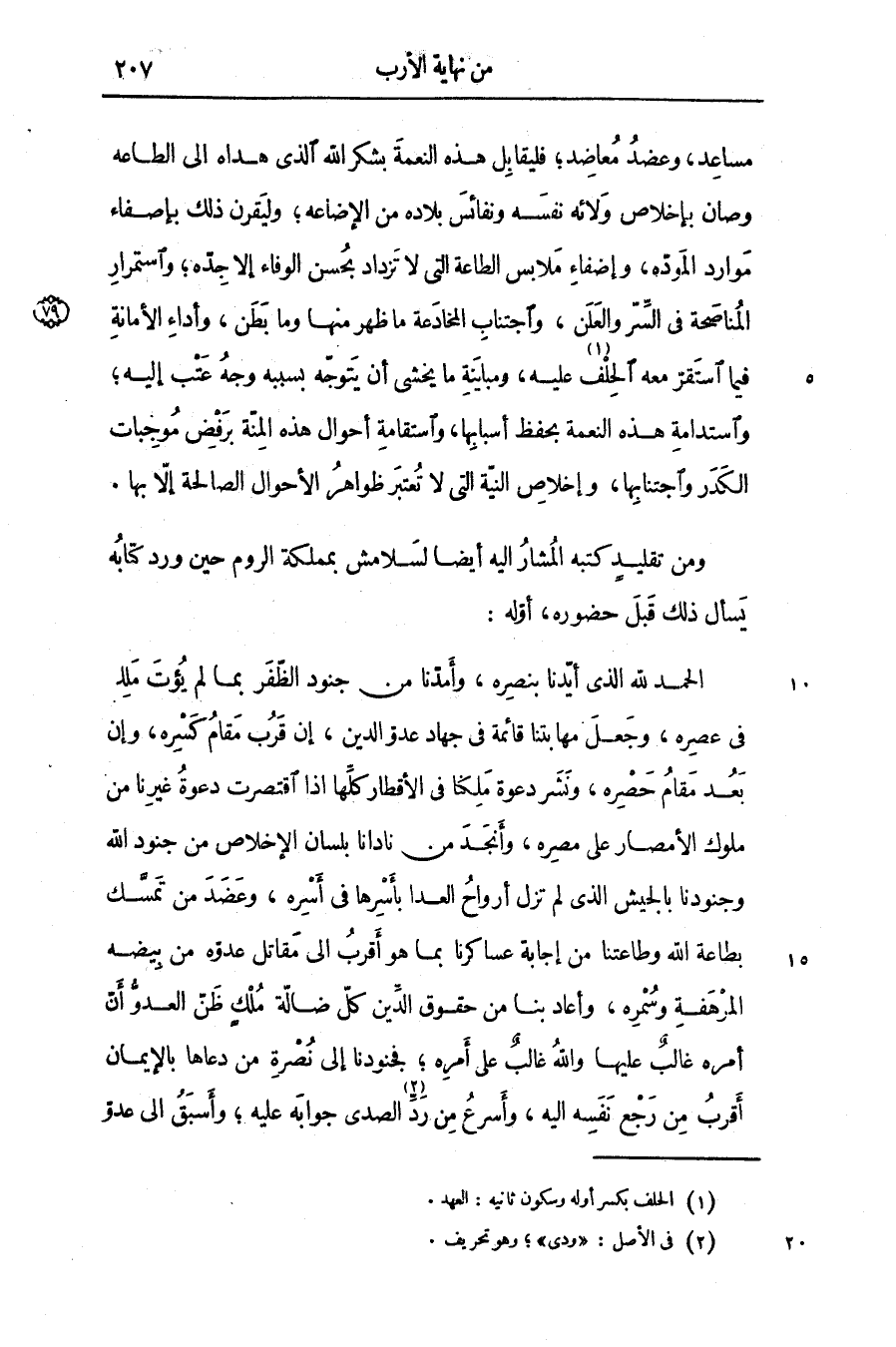 الحمد لله الذى أيّدنا بنصره، وأمدّنا من جنود الظّفر بما لم يؤت ملك فى عصره، وجعل مهابتنا قائمة فى جهاد عدوّ الدين، إن قرب مقام كسره، وإن بعد مقام حصره، ونشر دعوة ملكنا فى الأقطار كلّها اذا اقتصرت دعوة غيرنا من ملوك الأمصار على مصره، وأنجد من نادانا بلسان الإخلاص من جنود الله وجنودنا بالجيش الذى لم تزل أرواح العدا بأسرها فى أسره، وعضد من تمسّك بطاعة الله وطاعتنا من إجابة عساكرنا بما هو أقرب الى مقاتل عدوّه من بيضه المرهفة وسمره، وأعاد بنا من حقوق الدّين كلّ ضالّة ملك ظنّ العدوّ أنّ أمره غالب عليها والله غالب على أمره؛ فجنودنا إلى نصرة من دعاها بالإيمان أقرب من رجع نفسه اليه، وأسرع من ردّ «2» الصدى جوابه عليه؛ وأسبق الى عدوّ