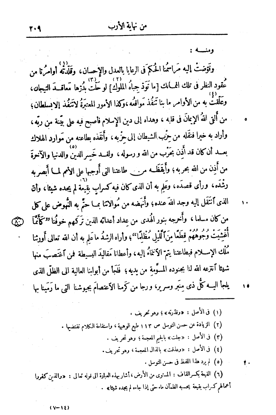 وفوّضت إليه مراسمنا الحكم فى الرعايا بالعدل والإحسان، وقلّدته «1» أوامرنا من عقود النظر فى تلك الممالك [ما تودّ جباه الملوك «2» ] لو حلّت «3» بدرّها معاقد التيجان، وعلّقت «4» به من الأوامر ما بنا تنفذ مواقعه، وكذا الأمور المعتبرة لا تنفذ إلا بسلطان؛ من ألقى الله الإيمان فى قلبه، وهداه إلى دين الإسلام فأصبح فيه على بيّنة من ربّه، وأراد به خيرا فنقله من حزب الشيطان إلى حزبه، وأنقذه بطاعته من موارد الهلاك بعد أن كان قد أذن بحرب من الله ورسوله، ولقد خسر الدين «5» والدنيا والآخرة من أذن من الله بحربه؛ وأيقظه من طاعتنا التى أوجبها على الأمم لما أبصر به رشده، ورأى قصده، وعلم به أن الذى كان فيه كسراب بقيعة «6» لم يجده شيئا، وأنّ الذى انتقل إليه وجد الله عنده؛ وأنهضه من موالاتنا بما حتّم به النّهوض على كل من كان مسلما، وأخرجه بنور الهدى من عداد أعدائه الذين تركهم خوفنا «كأنّما أغشيت وجوههم قطعا من اليّل مظلما» ؛ وأراه الرشد ما علم به أن الله تعالى أورثنا ملك الإسلام فبطاعتنا يتمّ الانتماء إليه، وأعطانا مقاليد البسيطة فمن اغتصب منها شيئا انتزعه الله لنا بجنوده المسوّمة من يديه؛ فلجأ من أبوابنا العالية الى الظلّ الذى يلجأ اليه كلّ ذى منبر وسرير، ورجا من كرمنا الاعتصام بجيوشنا التى ما رمينا بها
