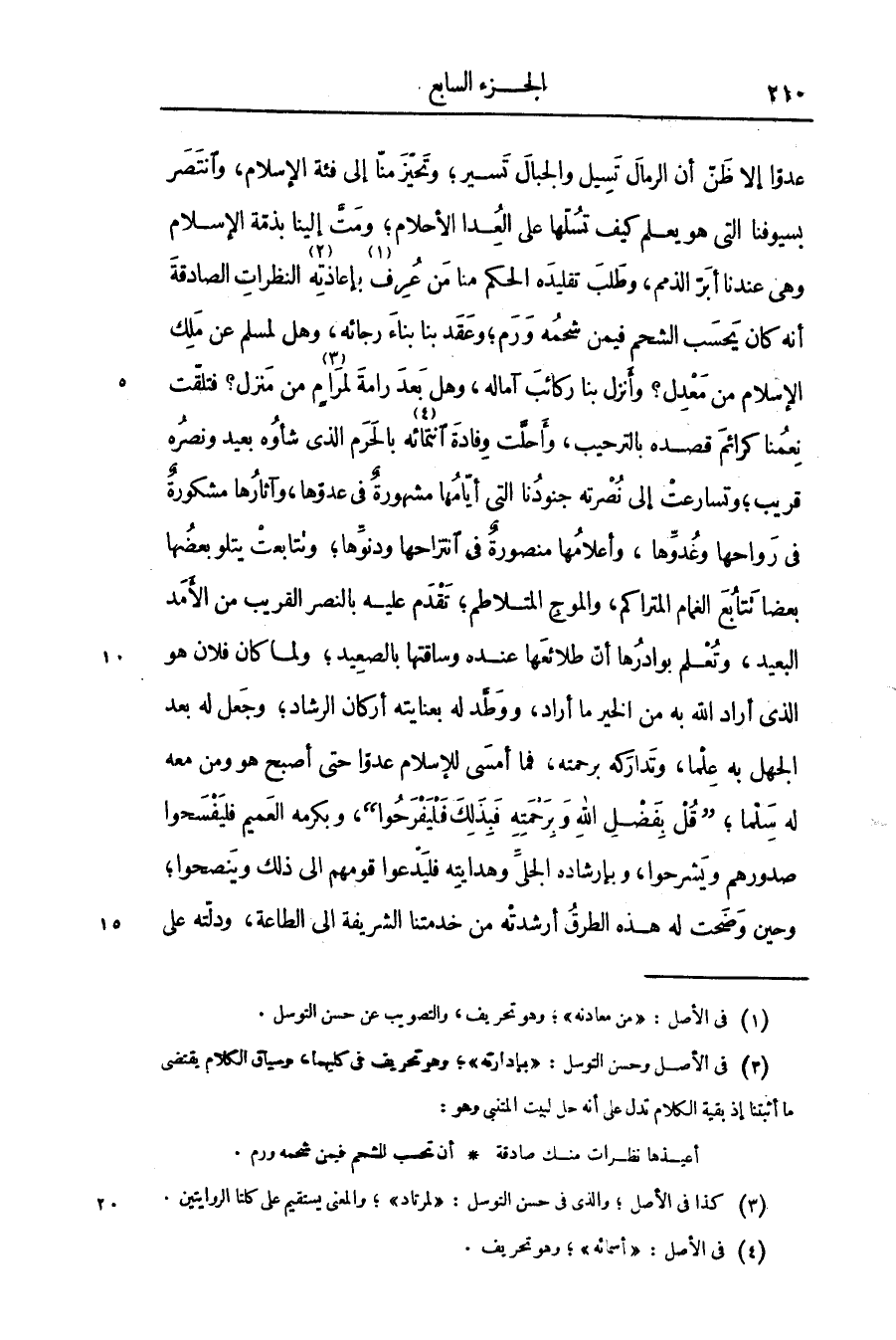 عدوّا إلا ظنّ أن الرمال تسيل والجبال تسير؛ وتحيز منّا إلى فئة الإسلام، وانتصر بسيوفنا التى هو يعلم كيف تسلّها على العدا الأحلام؛ ومتّ إلينا بذمّة الإسلام وهى عندنا أبرّ الذمم، وطلب تقليده الحكم منا من عرف «1» بإعاذته «2» النظرات الصادقة أنه كان يحسب الشحم فيمن شحمه ورم؛ وعقد بنا بناء رجائه، وهل لمسلم عن ملك الإسلام من معدل؟ وأنزل بنا ركائب آماله، وهل بعد رامة لمرام «3» من منزل؟ فتلقّت نعمنا كرائم قصده بالترحيب، وأحلّت وفادة انتمائه «4» بالحرم الذى شأوه بعيد ونصره قريب؛ وتسارعت إلى نصرته جنودنا التى أيّامها مشهورة فى عدوّها، وآثارها مشكورة فى رواحها وغدوّها، وأعلامها منصورة فى انتزاحها ودنوّها؛ وتتابعت يتلو بعضها بعضا تتابع الغمام المتراكم، والموج المتلاطم؛ تقدم عليه بالنصر القريب من الأمد البعيد، وتعلم بوادرها أنّ طلائعها عنده وساقتها بالصعيد؛ ولما كان فلان هو الذى أراد الله به من الخير ما أراد، ووطّد له بعنايته أركان الرشاد؛ وجعل له بعد الجهل به علما، وتداركه برحمته، فما أمسى للإسلام عدوّا حتى أصبح هو ومن معه له سلما؛ «قل بفضل الله وبرحمته فبذلك فليفرحوا» ، وبكرمه العميم فليفسحوا صدورهم ويشرحوا، وبإرشاده الجلىّ وهدايته فليدعوا قومهم الى ذلك وينصحوا؛ وحين وضحت له هذه الطرق أرشدته من خدمتنا الشريفة الى الطاعة، ودلّته على