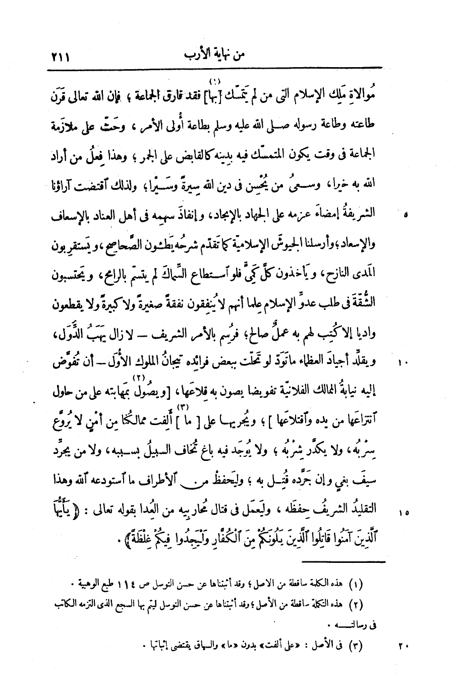 موالاة ملك الإسلام التى من لم يتمسّك [بها «1» ] فقد فارق الجماعة؛ فإن الله تعالى قرن طاعته وطاعة رسوله صلّى الله عليه وسلم بطاعة أولى الأمر، وحثّ على ملازمة الجماعة فى وقت يكون المتمسّك فيه بدينه كالقابض على الجمر؛ وهذا فعل من أراد الله به خيرا، وسعى من يحسن فى دين الله سيرة وسيرا؛ ولذلك اقتضت آراؤنا الشريفة إمضاء عزمه على الجهاد بالإمجاد، وإنفاذ سهمه فى أهل العناد بالإسعاف والإسعاد؛ وأرسلنا الجيوش الإسلاميّة كما تقدّم شرحه يطئون الصّحاصح، ويستقربون المدى النازح، ويأخذون كلّ كمىّ فلو استطاع السّماك لم يتسمّ بالرامح، ويحتسبون الشّقّة فى طلب عدوّ الإسلام علما أنهم لا ينفقون نفقة صغيرة ولا كبيرة ولا يقطعون واديا إلا كتب لهم به عمل صالح؛ فرسم بالأمر الشريف- لا زال يهب الدّول، ويقلّد أجياد العظماء ما تودّ لو تحلّت ببعض فرائده تيجان الملوك الأوّل- أن تفوّض إليه نيابة الممالك الفلانيّة تفويضا يصون به قلاعها، [ويصول «2» بمهابته على من حاول انتزاعها من يده واقتلاعها] ؛ ويجريها على [ما «3» ] ألفت مما لكنا من أمن لا يروّع سربه، ولا يكدّر شربه؛ ولا يوجد فيه باغ تخاف السبيل بسببه، ولا من يجرّد سيف بغى وطن جرّده قتل به؛ وليحفظ من الأطراف ما استودعه الله وهذا التقليد الشريف حفظه، وليعمل فى قتال محاربيه من العدا بقوله تعالى: يا أَيُّهَا الَّذِينَ آمَنُوا قاتِلُوا الَّذِينَ يَلُونَكُمْ مِنَ الْكُفَّارِ وَلْيَجِدُوا فِيكُمْ غِلْظَةً.