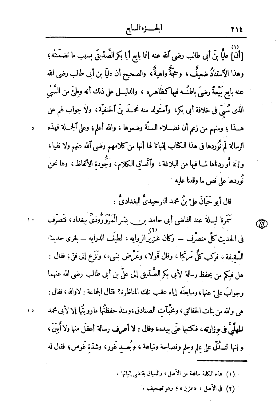 [أن «1» ] عليّا بن أبى طالب رضى الله عنه إنما بايع أبا بكر الصّدّيق بسبب ما تضمّنته؛ وهذا الاستناد ضعيف، وحجّة واهية، والصحيح أن عليّا بن أبى طالب رضى الله عنه بايع بيعة رضى باطنه فيها كظاهره، والدليل على ذلك أنه وطئ من السّبى الذى سبى فى خلافة أبى بكر، واستولد منه محمد بن الحنفيّة، ولا جواب لهم عن هذا؛ ومنهم من زعم أن فضلاء السنّة وضعوها، والله أعلم؛ وعلى الجملة فهذه الرسالة لم نوردها فى هذا الكتاب إثباتا لها أنها من كلامهم رضى الله عنهم ولا نفيا، وإنما أوردناها لما فيها من البلاغة، واتّساق الكلام، وجودة الألفاظ، وها نحن نوردها على نص ما وقفنا عليه قال أبو حيّان علىّ بن محمد التوحيدىّ البغدادىّ: